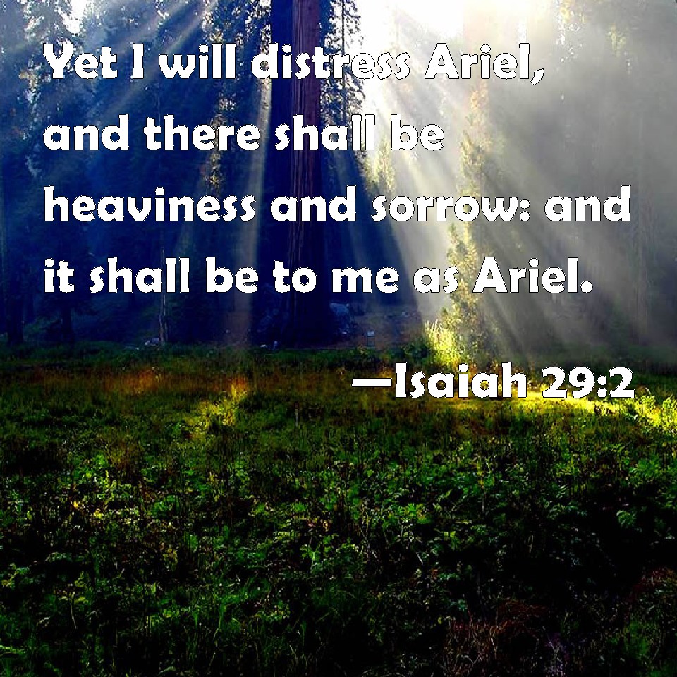 Choose a Background Isaiah 29:2 Yet I will distress Ariel, and there shall be heaviness and sorrow: and it shall be to me as Ariel. KJV: Yet I will distress Ariel, and there shall be heaviness and sorrow: and it shall be unto me as Ariel. DRB: And I will make a trench about Ariel, and it shall be in sorrow and mourning, and it shall be to me as Ariel. DBT: But I will distress Ariel, and there shall be sorrow and sadness; and it shall be unto me as an Ariel. ERV: then will I distress Ariel, and there shall be mourning and lamentation: and she shall be unto me as Ariel. WBT: Yet I will distress Ariel, and there shall be heaviness and sorrow; and it shall be to me as Ariel. WEB: then I will distress Ariel, and there will be mourning and lamentation. She shall be to me as an altar hearth. YLT: And I have sent distress to Ariel, And it hath been lamentation and mourning, And it hath been to me as Ariel.Links Isaiah 29:2 NIV • Isaiah 29:2 NLT • Isaiah 29:2 ESV • Isaiah 29:2 NASB • Isaiah 29:2 KJV • Isaiah 29:2 Interlinear • Isaiah 29:2 Commentaries • Isaiah 29:2 Parallel Texts • Isaiah 29:2 Bible Apps • Isaiah 29:2 Parallel • Bible Hub |