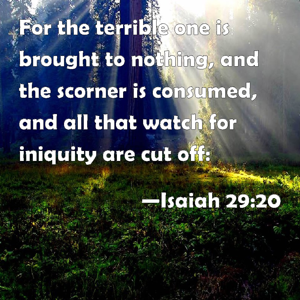 Choose a Background Isaiah 29:20 For the terrible one is brought to nothing, and the scorner is consumed, and all that watch for iniquity are cut off: KJV: For the terrible one is brought to nought, and the scorner is consumed, and all that watch for iniquity are cut off: DRB: For he that did prevail hath failed, the scorner is consumed, and they are all cut off that watched for iniquity: DBT: For the terrible one shall come to nought, and the scorner shall be no more, and all that watch for iniquity shall be cut off, ERV: For the terrible one is brought to nought, and the scorner ceaseth, and all they that watch for iniquity are cut off: WBT: For the terrible one is brought to naught, and the scoffer is consumed, and all that watch for iniquity are cut off: WEB: For the ruthless is brought to nothing, and the scoffer ceases, and all those who are alert to do evil are cut off— YLT: For ceased hath the terrible one, And consumed hath been the scorner, And cut off have been all watching for iniquity,Links Isaiah 29:20 NIV • Isaiah 29:20 NLT • Isaiah 29:20 ESV • Isaiah 29:20 NASB • Isaiah 29:20 KJV • Isaiah 29:20 Interlinear • Isaiah 29:20 Commentaries • Isaiah 29:20 Parallel Texts • Isaiah 29:20 Bible Apps • Isaiah 29:20 Parallel • Bible Hub |