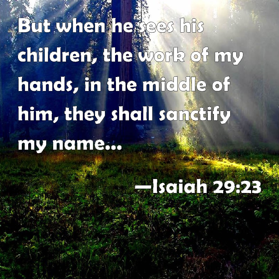 Choose a Background Isaiah 29:23 But when he sees his children, the work of my hands, in the middle of him, they shall sanctify my name, and sanctify the Holy One of Jacob, and shall fear the God of Israel. KJV: But when he seeth his children, the work of mine hands, in the midst of him, they shall sanctify my name, and sanctify the Holy One of Jacob, and shall fear the God of Israel. DRB: But when he shall see his children, the work of my hands in the midst of him sanctifying my name, and they shall sanctify the Holy One of Jacob, and shall glorify the God of Israel: DBT: for when he seeth his children, the work of my hands, in the midst of him, they shall hallow my name, and hallow the Holy One of Jacob, and shall fear the God of Israel. ERV: But when he seeth his children, the work of mine hands, in the midst of him, they shall sanctify my name; yea, they shall sanctify the Holy One of Jacob, and shall stand in awe of the God of Israel. WBT: But when he seeth his children, the work of my hands, in the midst of him, they shall sanctify my name, and sanctify the Holy One of Jacob, and shall fear the God of Israel. WEB: But when he sees his children, the work of my hands, in the midst of him, they will sanctify my name. Yes, they will sanctify the Holy One of Jacob, and will stand in awe of the God of Israel. YLT: For in his seeing his children, The work of My hand, in his midst, They sanctify My name, And have sanctified the Holy One of Jacob, And the God of Israel they declare fearful.Links Isaiah 29:23 NIV • Isaiah 29:23 NLT • Isaiah 29:23 ESV • Isaiah 29:23 NASB • Isaiah 29:23 KJV • Isaiah 29:23 Interlinear • Isaiah 29:23 Commentaries • Isaiah 29:23 Parallel Texts • Isaiah 29:23 Bible Apps • Isaiah 29:23 Parallel • Bible Hub |