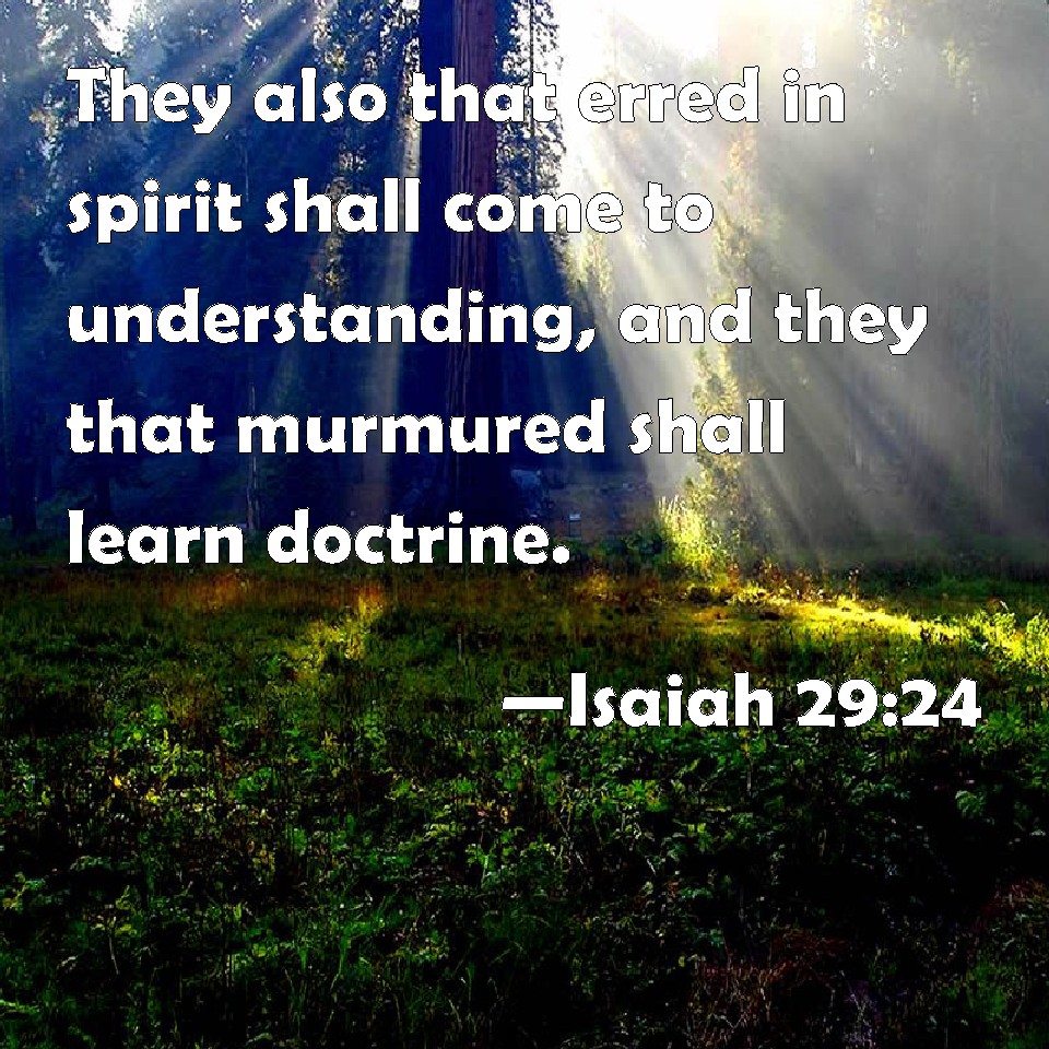 Choose a Background Isaiah 29:24 They also that erred in spirit shall come to understanding, and they that murmured shall learn doctrine. KJV: They also that erred in spirit shall come to understanding, and they that murmured shall learn doctrine. DRB: And they that erred in spirit, shall know understanding, and they that murmured, shall learn the law. DBT: And they that are of erring spirit shall know understanding, and the disobedient shall learn doctrine. ERV: They also that err in spirit shall come to understanding, and they that murmur shall learn doctrine. WBT: They also that erred in spirit shall come to understanding, and they that murmured shall learn doctrine. WEB: They also who err in spirit will come to understanding, and those who grumble will receive instruction." YLT: And the erring in spirit have known understanding, And murmurers learn doctrine!'Links Isaiah 29:24 NIV • Isaiah 29:24 NLT • Isaiah 29:24 ESV • Isaiah 29:24 NASB • Isaiah 29:24 KJV • Isaiah 29:24 Interlinear • Isaiah 29:24 Commentaries • Isaiah 29:24 Parallel Texts • Isaiah 29:24 Bible Apps • Isaiah 29:24 Parallel • Bible Hub |