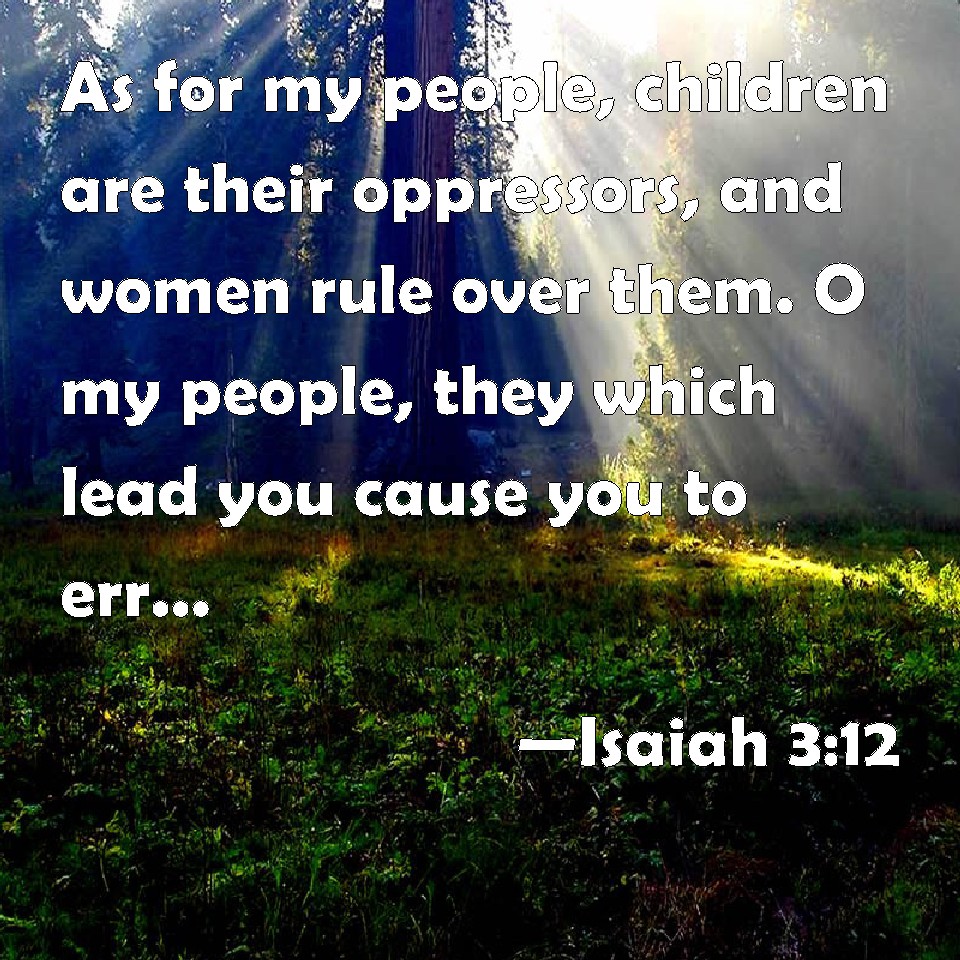 Choose a Background Isaiah 3:12 As for my people, children are their oppressors, and women rule over them. O my people, they which lead you cause you to err, and destroy the way of your paths. KJV: As for my people, children are their oppressors, and women rule over them. O my people, they which lead thee cause thee to err, and destroy the way of thy paths. DRB: As for my people, their oppressors have stripped them, and women have ruled over them. O my people, they that call thee blessed, the same deceive thee, and destroy the way of thy steps. DBT: As for my people, children are their oppressors, and women rule over them. My people! they that guide thee mislead thee, and destroy the way of thy paths. ERV: As for my people, children are their oppressors, and women rule over them. O my people, they which lead thee cause thee to err, and destroy the way of thy paths. WBT: As for my people, children are their oppressors, and women rule over them. O my people, they who lead thee cause thee to err, and destroy the way of thy paths. WEB: As for my people, children are their oppressors, and women rule over them. My people, those who lead you cause you to err, and destroy the way of your paths. YLT: My people — its exactors are sucklings, And women have ruled over it. My people — thy eulogists are causing to err, And the way of thy paths swallowed up.Links Isaiah 3:12 NIV • Isaiah 3:12 NLT • Isaiah 3:12 ESV • Isaiah 3:12 NASB • Isaiah 3:12 KJV • Isaiah 3:12 Interlinear • Isaiah 3:12 Commentaries • Isaiah 3:12 Parallel Texts • Isaiah 3:12 Bible Apps • Isaiah 3:12 Parallel • Bible Hub |