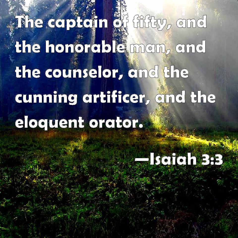 Choose a Background Isaiah 3:3 The captain of fifty, and the honorable man, and the counselor, and the cunning artificer, and the eloquent orator. KJV: The captain of fifty, and the honourable man, and the counseller, and the cunning artificer, and the eloquent orator. DRB: The captain over fifty, and the honourable in countenance, and the counsellor, and the architect, and the skilful in eloquent speech. DBT: the captain of fifty, and the honourable man, and the counsellor, and the clever among artificers, and the one versed in enchantments. ERV: the captain of fifty, and the honourable man, and the counsellor, and the cunning artificer, and the skilful enchanter. WBT: The captain of fifty, and the honorable man, and the counselor, and the skillful artificer, and the eloquent orator. WEB: the captain of fifty, the honorable man, the counselor, the skilled craftsman, and the clever enchanter. YLT: Head of fifty, and accepted of faces, And counsellor, and the wise of artificers, And the intelligent of charmers.Links Isaiah 3:3 NIV • Isaiah 3:3 NLT • Isaiah 3:3 ESV • Isaiah 3:3 NASB • Isaiah 3:3 KJV • Isaiah 3:3 Interlinear • Isaiah 3:3 Commentaries • Isaiah 3:3 Parallel Texts • Isaiah 3:3 Bible Apps • Isaiah 3:3 Parallel • Bible Hub |