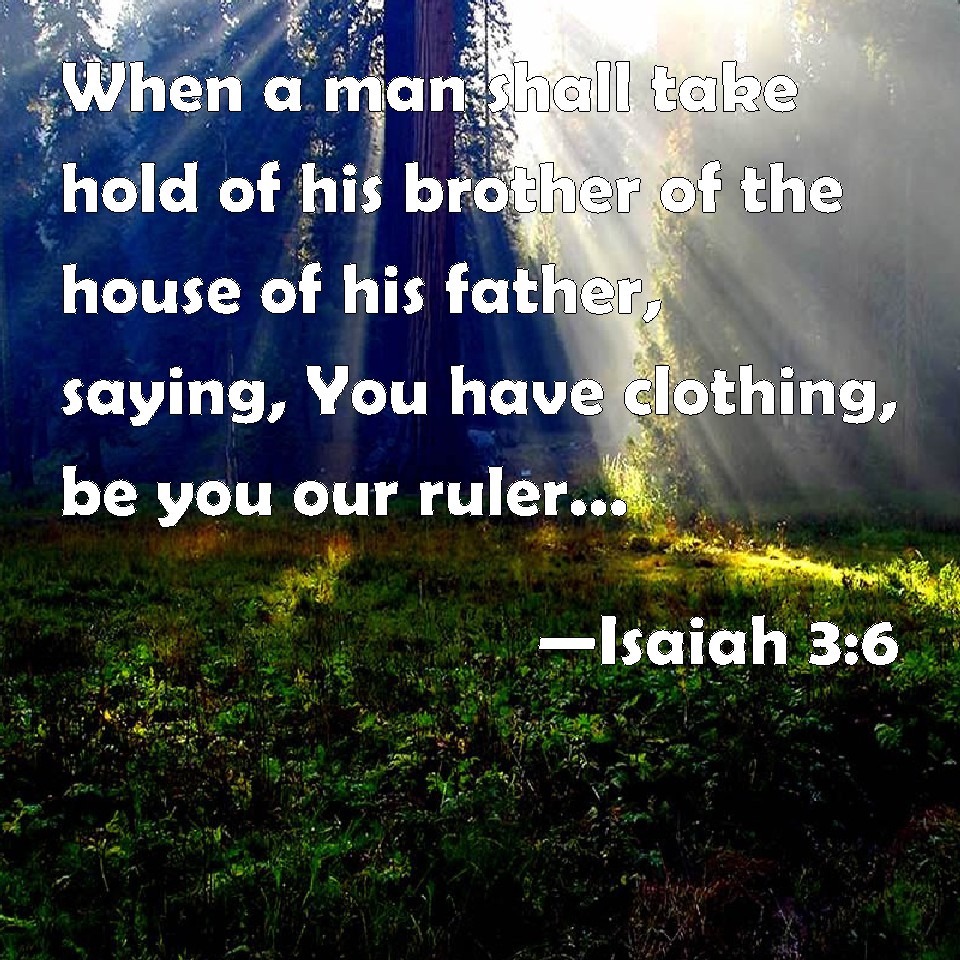 Choose a Background Isaiah 3:6 When a man shall take hold of his brother of the house of his father, saying, You have clothing, be you our ruler, and let this ruin be under your hand: KJV: When a man shall take hold of his brother of the house of his father, saying, Thou hast clothing, be thou our ruler, and let this ruin be under thy hand: DRB: For a man shall take hold or his brother, one of the house of his father, saying: Thou hast a garment, be thou our ruler, and let this ruin be under thy hand. DBT: When a man shall take hold of his brother, in his father's house, and shall say: Thou hast clothing; be our chief, and let this ruin be under thy hand; ERV: When a man shall take hold of his brother in the house of his father, saying, Thou hast clothing, be thou our ruler, and let this ruin be under thy hand: WBT: When a man shall take hold of his brother of the house of his father, saying, Thou hast clothing, be thou our ruler, and let this ruin be under thy hand: WEB: Indeed a man shall take hold of his brother in the house of his father, saying, "You have clothing, you be our ruler, and let this ruin be under your hand." YLT: When one layeth hold on his brother, Of the house of his father, by the garment, 'Come, a ruler thou art to us, And this ruin is under thy hand.'Links Isaiah 3:6 NIV • Isaiah 3:6 NLT • Isaiah 3:6 ESV • Isaiah 3:6 NASB • Isaiah 3:6 KJV • Isaiah 3:6 Interlinear • Isaiah 3:6 Commentaries • Isaiah 3:6 Parallel Texts • Isaiah 3:6 Bible Apps • Isaiah 3:6 Parallel • Bible Hub |