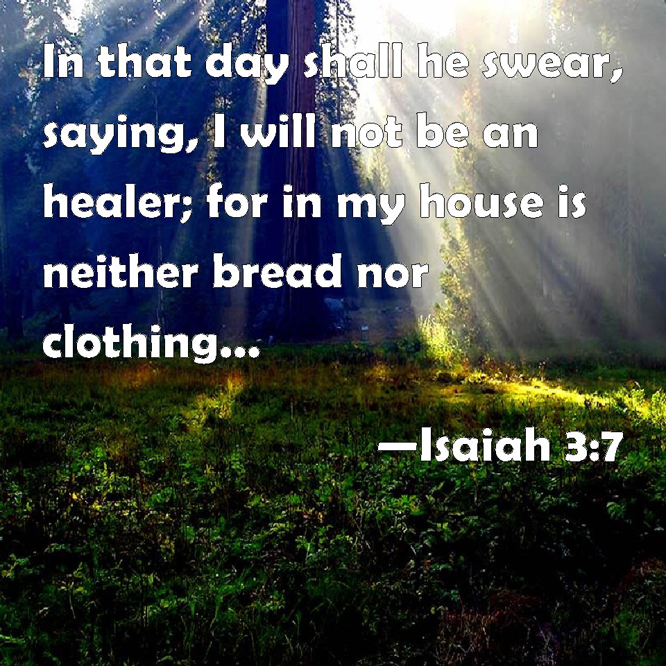 Choose a Background Isaiah 3:7 In that day shall he swear, saying, I will not be an healer; for in my house is neither bread nor clothing: make me not a ruler of the people. KJV: In that day shall he swear, saying, I will not be an healer; for in my house is neither bread nor clothing: make me not a ruler of the people. DRB: In that day he shall answer, saying: I am no healer, and in my house there is no bread, nor clothing: make me not ruler of the people. DBT: he will lift up his hand in that day, saying, I cannot be a healer, and in my house there is neither bread nor clothing; ye shall not make me a chief of the people. ERV: in that day shall he lift up his voice, saying, I will not be an healer; for in my house is neither bread nor clothing: ye shall not make me ruler of the people. WBT: In that day shall he swear, saying, I will not be a healer; for in my house is neither bread nor clothing: make me not a ruler of the people. WEB: In that day he will cry out, saying, "I will not be a healer; for in my house is neither bread nor clothing. You shall not make me ruler of the people." YLT: He lifteth up, in that day, saying: 'I am not a binder up, And in my house is neither bread nor garment, Ye do not make me a ruler of the people.'Links Isaiah 3:7 NIV • Isaiah 3:7 NLT • Isaiah 3:7 ESV • Isaiah 3:7 NASB • Isaiah 3:7 KJV • Isaiah 3:7 Interlinear • Isaiah 3:7 Commentaries • Isaiah 3:7 Parallel Texts • Isaiah 3:7 Bible Apps • Isaiah 3:7 Parallel • Bible Hub |