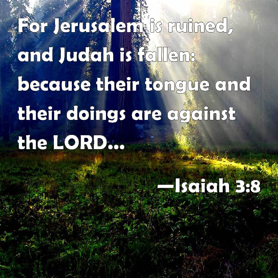 Choose a Background Isaiah 3:8 For Jerusalem is ruined, and Judah is fallen: because their tongue and their doings are against the LORD, to provoke the eyes of his glory. KJV: For Jerusalem is ruined, and Judah is fallen: because their tongue and their doings are against the LORD, to provoke the eyes of his glory. DRB: For Jerusalem is ruined, and Juda is fallen: because their tongue, and their devices are against the Lord, to provoke the eyes of his majesty. DBT: For Jerusalem stumbleth and Judah falleth, because their tongue and their doings are against Jehovah, to provoke the eyes of his glory. ERV: For Jerusalem is ruined, and Judah is fallen: because their tongue and their doings are against the LORD, to provoke the eyes of his glory. WBT: For Jerusalem is ruined, and Judah is fallen: because their tongue and their doings are against the LORD, to provoke the eyes of his glory. WEB: For Jerusalem is ruined, and Judah is fallen; because their tongue and their doings are against Yahweh, to provoke the eyes of his glory. YLT: For stumbled hath Jerusalem, and Judah hath fallen, For their tongue and their doings are against Jehovah, To provoke the eyes of His glory.Links Isaiah 3:8 NIV • Isaiah 3:8 NLT • Isaiah 3:8 ESV • Isaiah 3:8 NASB • Isaiah 3:8 KJV • Isaiah 3:8 Interlinear • Isaiah 3:8 Commentaries • Isaiah 3:8 Parallel Texts • Isaiah 3:8 Bible Apps • Isaiah 3:8 Parallel • Bible Hub |