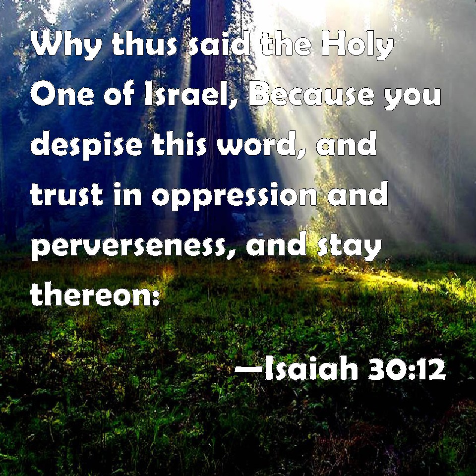 Choose a Background Isaiah 30:12 Why thus said the Holy One of Israel, Because you despise this word, and trust in oppression and perverseness, and stay thereon: KJV: Wherefore thus saith the Holy One of Israel, Because ye despise this word, and trust in oppression and perverseness, and stay thereon: DRB: Therefore thus saith the Holy One of Israel: Because you have rejected this word, and have trusted in oppression and tumult, and have leaned upon it: DBT: Therefore thus saith the Holy One of Israel: Because ye reject this word, and confide in oppression and wilfulness, and depend thereon, ERV: Wherefore thus saith the Holy One of Israel, Because ye despise this word, and trust in oppression and perverseness, and stay thereon; WBT: Wherefore thus saith the Holy One of Israel, Because ye despise this word, and trust in oppression and perverseness, and lean upon it: WEB: Therefore thus says the Holy One of Israel, "Because you despise this word, and trust in oppression and perverseness, and rely on it; YLT: Therefore, thus said the Holy One of Israel, Because of your kicking against this word, And ye trust in oppression, And perverseness, and rely on it,Links Isaiah 30:12 NIV • Isaiah 30:12 NLT • Isaiah 30:12 ESV • Isaiah 30:12 NASB • Isaiah 30:12 KJV • Isaiah 30:12 Interlinear • Isaiah 30:12 Commentaries • Isaiah 30:12 Parallel Texts • Isaiah 30:12 Bible Apps • Isaiah 30:12 Parallel • Bible Hub |