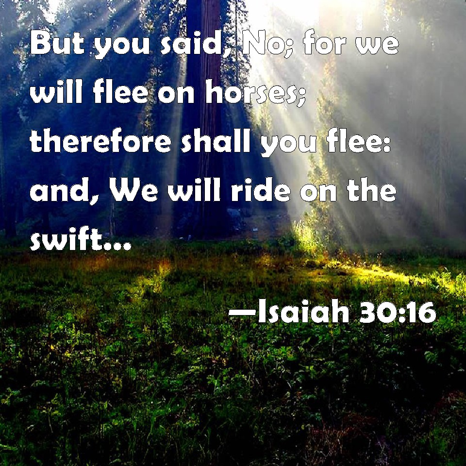 Choose a Background Isaiah 30:16 But you said, No; for we will flee on horses; therefore shall you flee: and, We will ride on the swift; therefore shall they that pursue you be swift. KJV: But ye said, No; for we will flee upon horses; therefore shall ye flee: and, We will ride upon the swift; therefore shall they that pursue you be swift. DRB: But have said: No, but we will flee to horses: therefore shall you flee. And we will mount upon swift ones: therefore shall they be swifter that shall pursue after you. DBT: And ye said, No, but we will flee upon horses, therefore shall ye flee; and, We will ride upon the swift, therefore shall they that pursue you be swift. ERV: but ye said, No, for we will flee upon horses; therefore shall ye flee: and, We will ride upon the swift; therefore shall they that pursue you be swift. WBT: But ye said, No; for we will flee upon horses; therefore shall ye flee: and, We will ride upon the swift; therefore shall they that pursue you be swift. WEB: but you said, "No, for we will flee on horses;" therefore you will flee; and, "We will ride on the swift;" therefore those who pursue you will be swift. YLT: And ye say, No, for on a horse we flee? Therefore ye flee, And on the swift we ride! Therefore swift are your pursuers.Links Isaiah 30:16 NIV • Isaiah 30:16 NLT • Isaiah 30:16 ESV • Isaiah 30:16 NASB • Isaiah 30:16 KJV • Isaiah 30:16 Interlinear • Isaiah 30:16 Commentaries • Isaiah 30:16 Parallel Texts • Isaiah 30:16 Bible Apps • Isaiah 30:16 Parallel • Bible Hub |