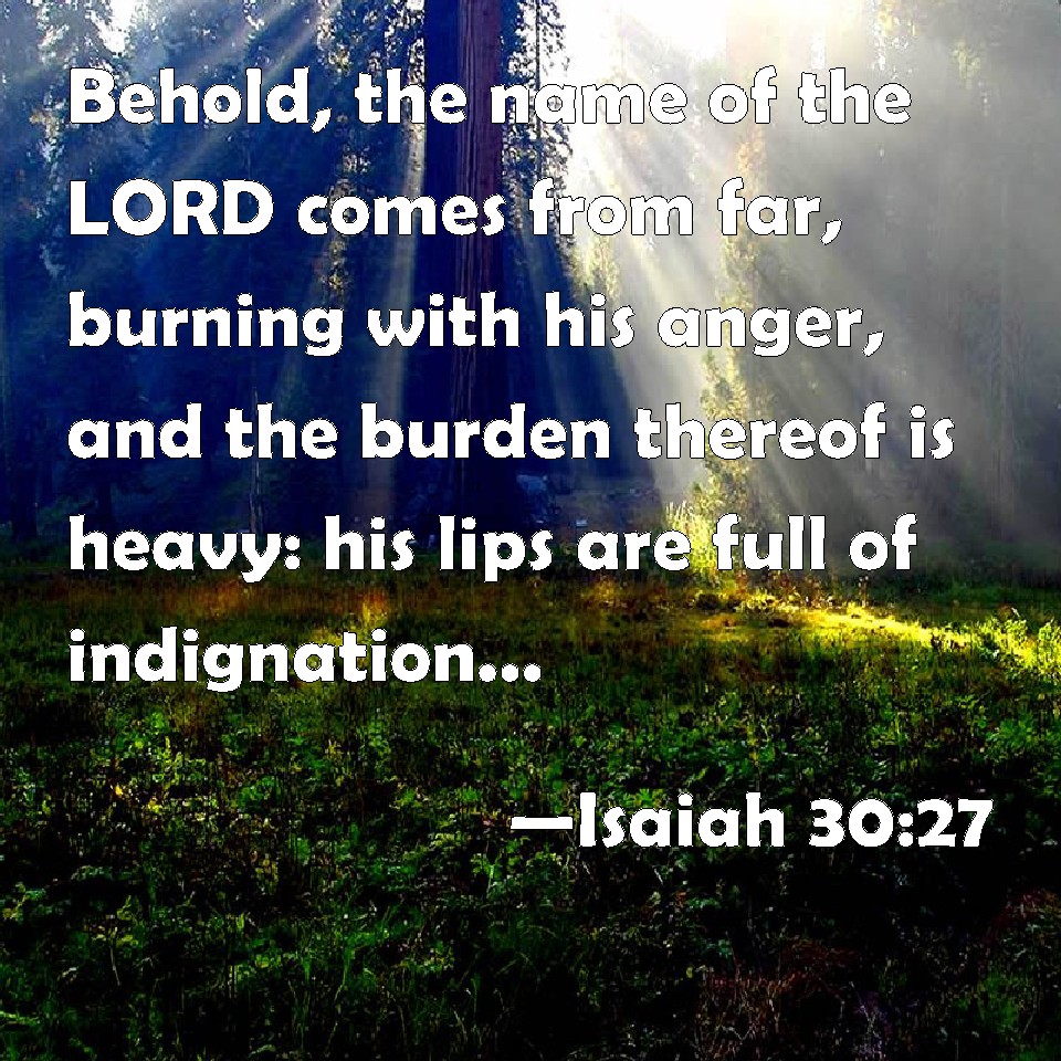 Choose a Background Isaiah 30:27 Behold, the name of the LORD comes from far, burning with his anger, and the burden thereof is heavy: his lips are full of indignation, and his tongue as a devouring fire: KJV: Behold, the name of the LORD cometh from far, burning with his anger, and the burden thereof is heavy: his lips are full of indignation, and his tongue as a devouring fire: DRB: Behold the name of the Lord cometh from afar, his wrath burneth, and is heavy to bear: his lips are filled with indignation, and his tongue as a devouring fire. DBT: Behold, the name of Jehovah cometh from far, burning with his anger a grievous conflagration; his lips are full of indignation, and his tongue as a consuming fire; ERV: Behold, the name of the LORD cometh from far, burning with his anger, and in thick rising smoke: his lips are full of indignation, and his tongue is as a devouring fire: WBT: Behold, the name of the LORD cometh from far, burning with his anger, and the burden of it is heavy: his lips are full of indignation, and his tongue as a devouring fire: WEB: Behold, the name of Yahweh comes from far away, burning with his anger, and in thick rising smoke. His lips are full of indignation, and his tongue is as a devouring fire. YLT: Lo, the name of Jehovah is coming from far, Burning is His anger, and great the flame, His lips have been full of indignation, And His tongue is as a devouring fire.Links Isaiah 30:27 NIV • Isaiah 30:27 NLT • Isaiah 30:27 ESV • Isaiah 30:27 NASB • Isaiah 30:27 KJV • Isaiah 30:27 Interlinear • Isaiah 30:27 Commentaries • Isaiah 30:27 Parallel Texts • Isaiah 30:27 Bible Apps • Isaiah 30:27 Parallel • Bible Hub |