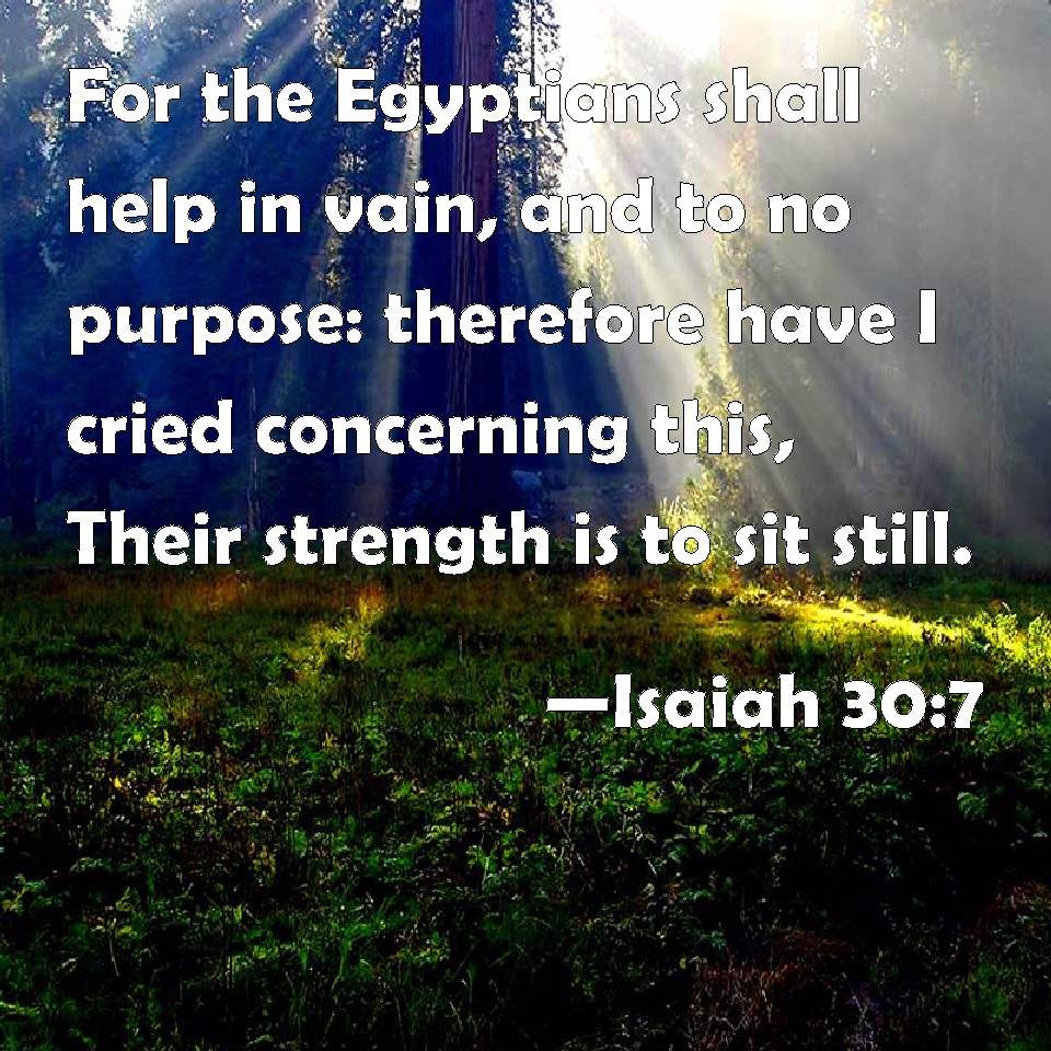 Choose a Background Isaiah 30:7 For the Egyptians shall help in vain, and to no purpose: therefore have I cried concerning this, Their strength is to sit still. KJV: For the Egyptians shall help in vain, and to no purpose: therefore have I cried concerning this, Their strength is to sit still. DRB: For Egypt shall help in vain, and to no purpose: therefore have I cried concerning this: It is pride only, sit still. DBT: For Egypt shall help in vain, and to no purpose; therefore have I named her, Arrogance, that doeth nothing. ERV: For Egypt helpeth in vain, and to no purpose: therefore have I called her Rahab that sitteth still. WBT: For the Egyptian shall help in vain, and to no purpose: therefore have I cried concerning this, Their strength is to sit still. WEB: For Egypt helps in vain, and to no purpose; therefore have I called her Rahab who sits still. YLT: Yea, Egyptians are vanity, and in vain do help, Therefore I have cried concerning this: 'Their strength is to sit still.'Links Isaiah 30:7 NIV • Isaiah 30:7 NLT • Isaiah 30:7 ESV • Isaiah 30:7 NASB • Isaiah 30:7 KJV • Isaiah 30:7 Interlinear • Isaiah 30:7 Commentaries • Isaiah 30:7 Parallel Texts • Isaiah 30:7 Bible Apps • Isaiah 30:7 Parallel • Bible Hub |
