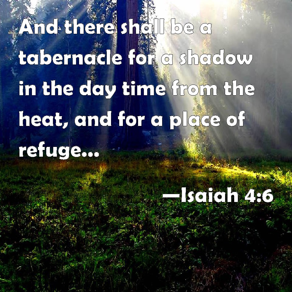 Choose a Background Isaiah 4:6 And there shall be a tabernacle for a shadow in the day time from the heat, and for a place of refuge, and for a covert from storm and from rain. KJV: And there shall be a tabernacle for a shadow in the daytime from the heat, and for a place of refuge, and for a covert from storm and from rain. DRB: And there shall be a tabernacle for a shade in the daytime from the heat, and for a security and covert from the whirlwind, and from rain. DBT: And there shall be a tabernacle for shade by day from the heat, and for a shelter and for a covert from storm and from rain. ERV: And there shall be a pavilion for a shadow in the day-time from the heat, and for a refuge and for a covert from storm and from rain. WBT: And there shall be a tabernacle for a shade in the day time from the heat, and for a place of refuge, and for a covert from storm and from rain. WEB: There will be a pavilion for a shade in the daytime from the heat, and for a refuge and for a shelter from storm and from rain. YLT: And a covering may be, For a shadow by day from drought, And for a refuge, and for a hiding place, From inundation and from rain!Links Isaiah 4:6 NIV • Isaiah 4:6 NLT • Isaiah 4:6 ESV • Isaiah 4:6 NASB • Isaiah 4:6 KJV • Isaiah 4:6 Interlinear • Isaiah 4:6 Commentaries • Isaiah 4:6 Parallel Texts • Isaiah 4:6 Bible Apps • Isaiah 4:6 Parallel • Bible Hub |