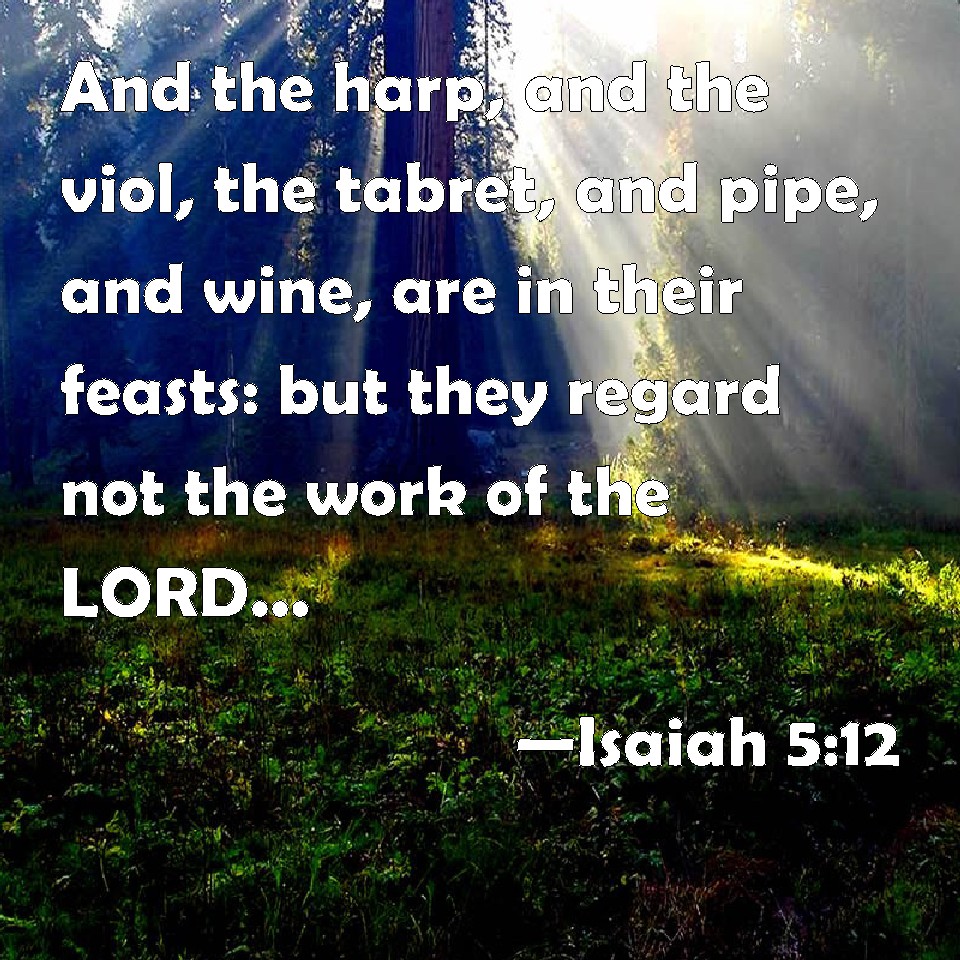 Choose a Background Isaiah 5:12 And the harp, and the viol, the tabret, and pipe, and wine, are in their feasts: but they regard not the work of the LORD, neither consider the operation of his hands. KJV: And the harp, and the viol, the tabret, and pipe, and wine, are in their feasts: but they regard not the work of the LORD, neither consider the operation of his hands. DRB: The harp, and the lyre, and the timbrel, and the pipe, and wine are in your feasts: and the work of the Lord you regard not, nor do you consider the works of his hands. DBT: And harp and lyre, tambour and flute, and wine are in their banquets; but they regard not the work of Jehovah, nor do they see the operation of his hands. ERV: And the harp and the lute, the tabret and the pipe, and wine, are in their feasts: but they regard not the work of the LORD, neither have they considered the operation of his hands. WBT: And the harp, and the viol, the tabret, and pipe, and wine, are in their feasts: but they regard not the work of the LORD, neither consider the operation of his hands. WEB: The harp, lyre, tambourine, and flute, with wine, are at their feasts; but they don't respect the work of Yahweh, neither have they considered the operation of his hands. YLT: And harp, and psaltery, tabret, and pipe, And wine, have been their banquets, And the work of Jehovah they behold not, Yea, the work of His hands they have not seen.Links Isaiah 5:12 NIV • Isaiah 5:12 NLT • Isaiah 5:12 ESV • Isaiah 5:12 NASB • Isaiah 5:12 KJV • Isaiah 5:12 Interlinear • Isaiah 5:12 Commentaries • Isaiah 5:12 Parallel Texts • Isaiah 5:12 Bible Apps • Isaiah 5:12 Parallel • Bible Hub |