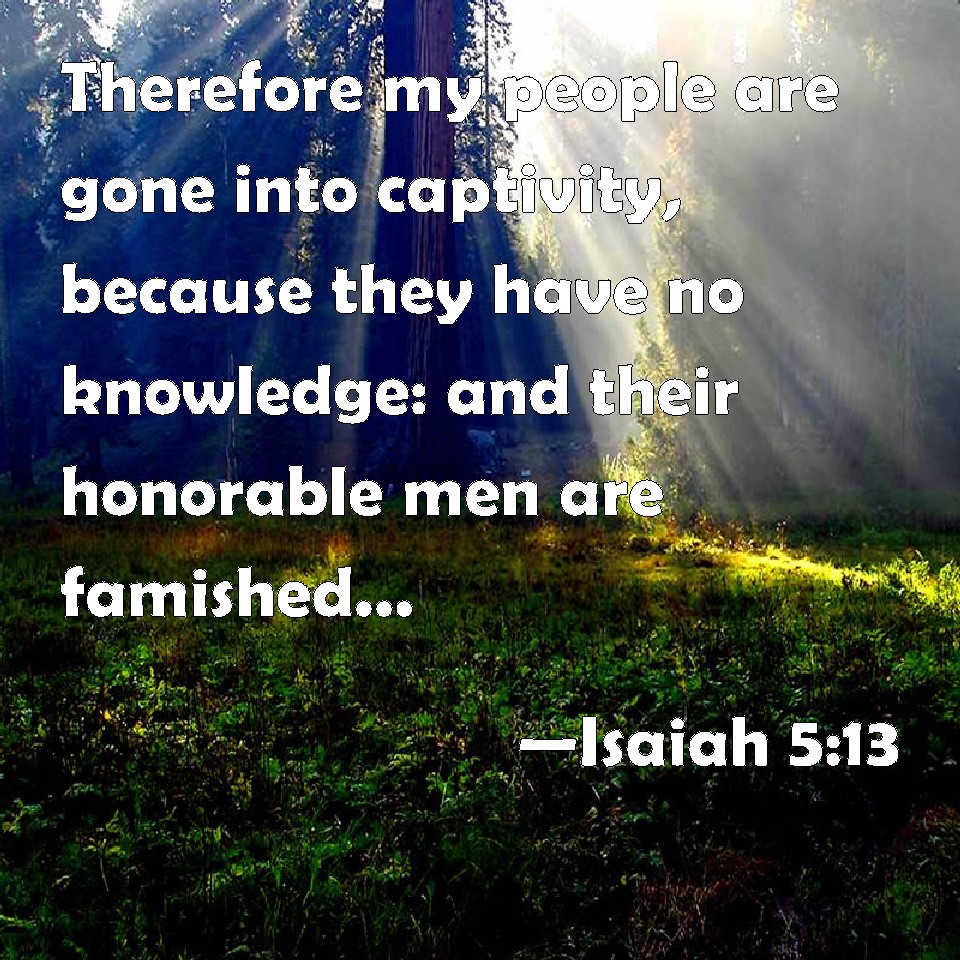 Choose a Background Isaiah 5:13 Therefore my people are gone into captivity, because they have no knowledge: and their honorable men are famished, and their multitude dried up with thirst. KJV: Therefore my people are gone into captivity, because they have no knowledge: and their honourable men are famished, and their multitude dried up with thirst. DRB: Therefore is my people led away captive, because they had not knowledge, and their nobles have perished with famine, and their multitude were dried up with thirst. DBT: Therefore my people are led away captive from lack of knowledge, and their nobility die of famine, and their multitude are parched with thirst. ERV: Therefore my people are gone into captivity, for lack of knowledge: and their honourable men are famished, and their multitude are parched with thirst. WBT: Therefore my people have gone into captivity, because they have no knowledge: and their honorable men are famished, and their multitude dried up with thirst. WEB: Therefore my people go into captivity for lack of knowledge. Their honorable men are famished, and their multitudes are parched with thirst. YLT: Therefore my people removed without knowledge, And its honourable ones are famished, And its multitude dried up of thirst.Links Isaiah 5:13 NIV • Isaiah 5:13 NLT • Isaiah 5:13 ESV • Isaiah 5:13 NASB • Isaiah 5:13 KJV • Isaiah 5:13 Interlinear • Isaiah 5:13 Commentaries • Isaiah 5:13 Parallel Texts • Isaiah 5:13 Bible Apps • Isaiah 5:13 Parallel • Bible Hub |