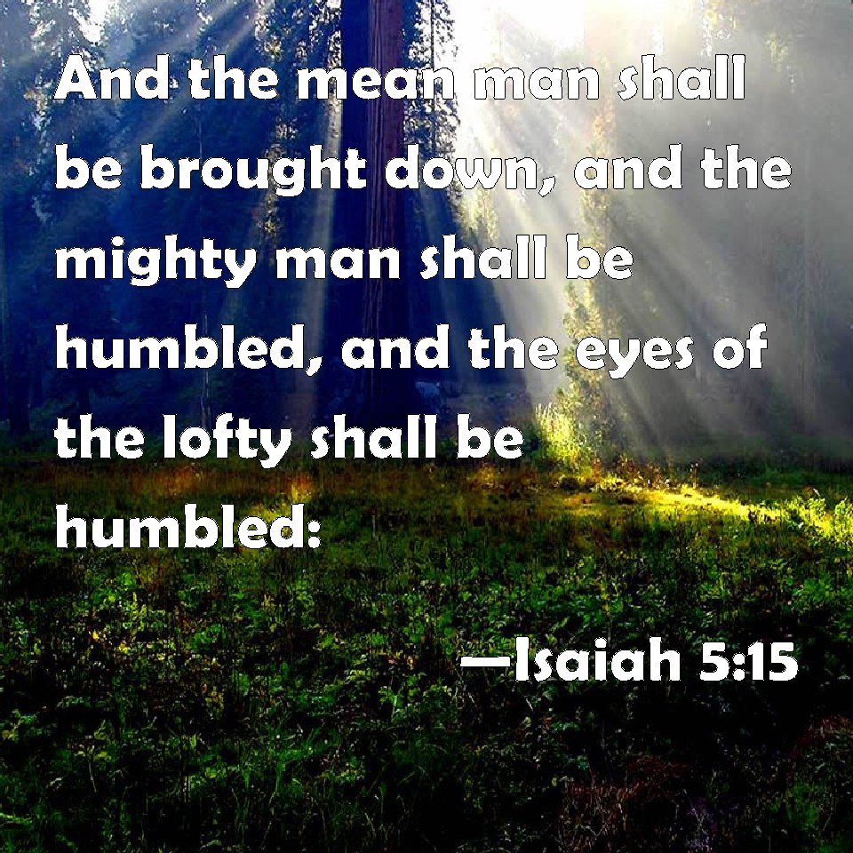 Choose a Background Isaiah 5:15 And the mean man shall be brought down, and the mighty man shall be humbled, and the eyes of the lofty shall be humbled: KJV: And the mean man shall be brought down, and the mighty man shall be humbled, and the eyes of the lofty shall be humbled: DRB: And man shall be brought down, and man shall be humbled, and the eyes of the lofty shall be brought low. DBT: And the mean man shall be bowed down, and the great man brought low, and the eyes of the lofty shall be brought low; ERV: And the mean man is bowed down, and the great man is humbled, and the eyes of the lofty are humbled: WBT: And the mean man shall be brought down, and the mighty man shall be humbled, and the eyes of the lofty shall be abased. WEB: So man is brought low, mankind is humbled, and the eyes of the arrogant ones are humbled; YLT: And bowed down is the low, and humbled the high, And the eyes of the haughty become low,Links Isaiah 5:15 NIV • Isaiah 5:15 NLT • Isaiah 5:15 ESV • Isaiah 5:15 NASB • Isaiah 5:15 KJV • Isaiah 5:15 Interlinear • Isaiah 5:15 Commentaries • Isaiah 5:15 Parallel Texts • Isaiah 5:15 Bible Apps • Isaiah 5:15 Parallel • Bible Hub |