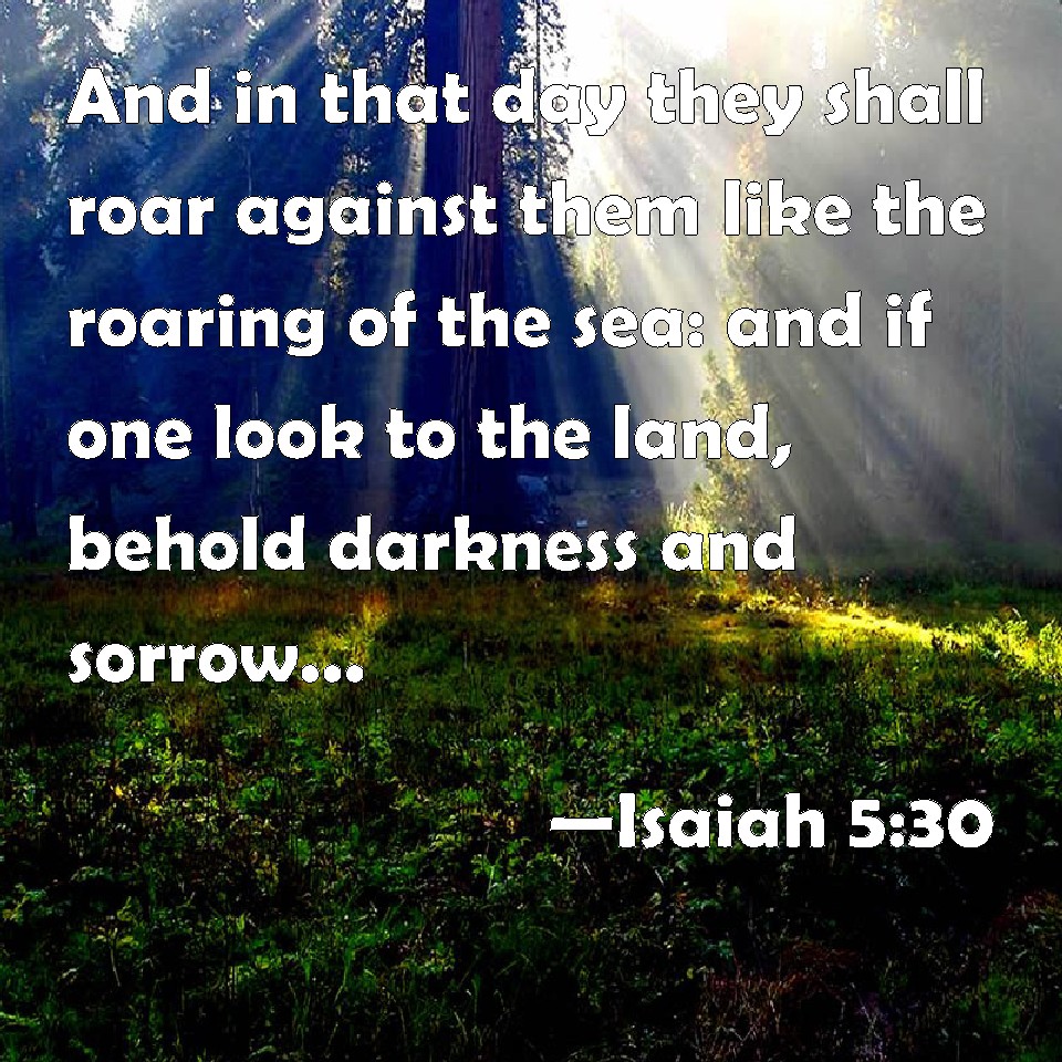 Choose a Background Isaiah 5:30 And in that day they shall roar against them like the roaring of the sea: and if one look to the land, behold darkness and sorrow, and the light is darkened in the heavens thereof. KJV: And in that day they shall roar against them like the roaring of the sea: and if one look unto the land, behold darkness and sorrow, and the light is darkened in the heavens thereof. DRB: And they shall make a noise against them that day, like the roaring of the sea; we shall look towards the land, and behold darkness of tribulation, and the light is darkened with the mist thereof. DBT: and they shall roar against them in that day like the roaring of the sea. And if one look upon the earth, behold darkness and distress, and the light is darkened in the heavens thereof. ERV: And they shall roar against them in that day like the roaring of the sea: and if one look unto the land, behold darkness and distress, and the light is darkened in the clouds thereof. WBT: And in that day they shall roar against them like the roaring of the sea: and if one looketh to the land, behold darkness and sorrow, and the light is darkened in its heavens. WEB: They will roar against them in that day like the roaring of the sea. If one looks to the land behold, darkness and distress. The light is darkened in its clouds. YLT: And it howleth against it in that day as the howling of a sea, And it hath looked attentively to the land, And lo, darkness — distress, And light hath been darkened by its abundance!Links Isaiah 5:30 NIV • Isaiah 5:30 NLT • Isaiah 5:30 ESV • Isaiah 5:30 NASB • Isaiah 5:30 KJV • Isaiah 5:30 Interlinear • Isaiah 5:30 Commentaries • Isaiah 5:30 Parallel Texts • Isaiah 5:30 Bible Apps • Isaiah 5:30 Parallel • Bible Hub |