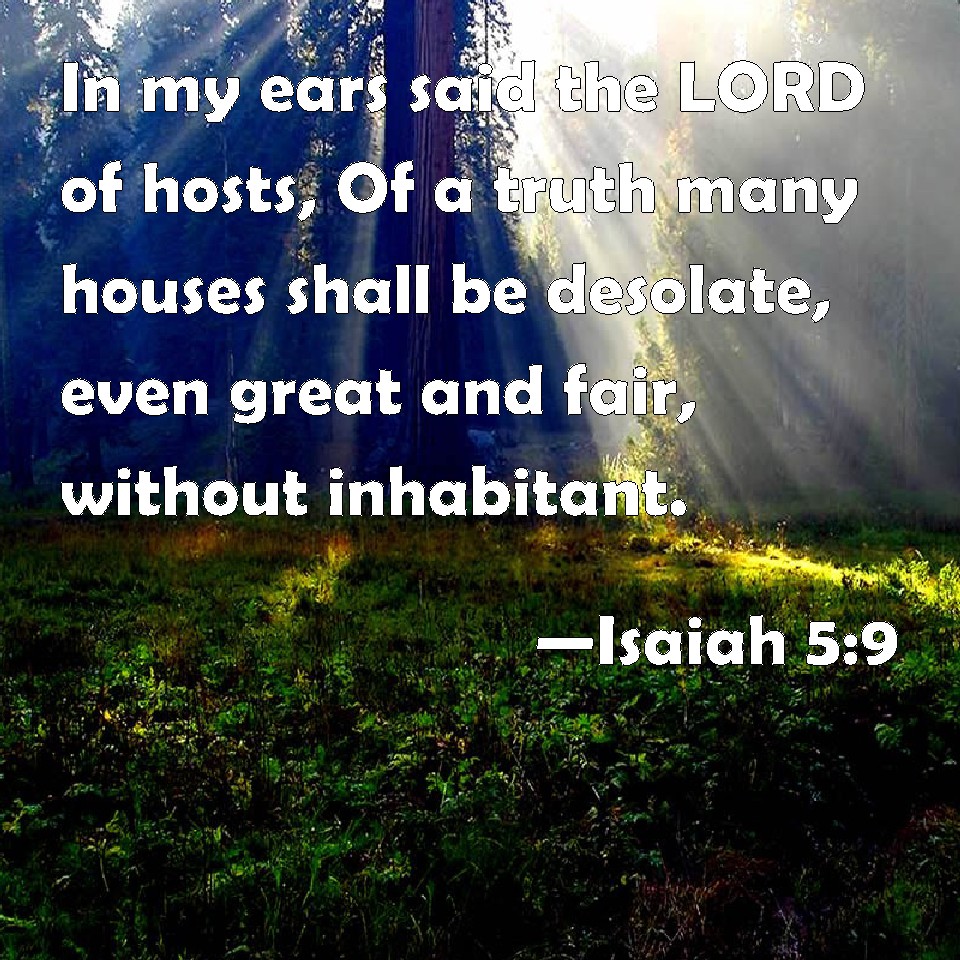 Choose a Background Isaiah 5:9 In my ears said the LORD of hosts, Of a truth many houses shall be desolate, even great and fair, without inhabitant. KJV: In mine ears said the LORD of hosts, Of a truth many houses shall be desolate, even great and fair, without inhabitant. DRB: These things are in my ears, saith the Lord of hosts: Unless many great and fair houses shall become desolate, without an inhabitant. DBT: In mine ears Jehovah of hosts hath said, Many houses shall assuredly become a desolation, great and excellent ones, without inhabitant. ERV: In mine ears saith the LORD of hosts, Of a truth many houses shall be desolate, even great and fair, without inhabitant. WBT: In my ears said the LORD of hosts, Of a truth many houses shall be desolate, even great and fair, without inhabitant. WEB: In my ears, Yahweh of Armies says: "Surely many houses will be desolate, even great and beautiful, unoccupied. YLT: By the weapons of Jehovah of Hosts Do not many houses a desolation become? Great and good without inhabitant!Links Isaiah 5:9 NIV • Isaiah 5:9 NLT • Isaiah 5:9 ESV • Isaiah 5:9 NASB • Isaiah 5:9 KJV • Isaiah 5:9 Interlinear • Isaiah 5:9 Commentaries • Isaiah 5:9 Parallel Texts • Isaiah 5:9 Bible Apps • Isaiah 5:9 Parallel • Bible Hub |