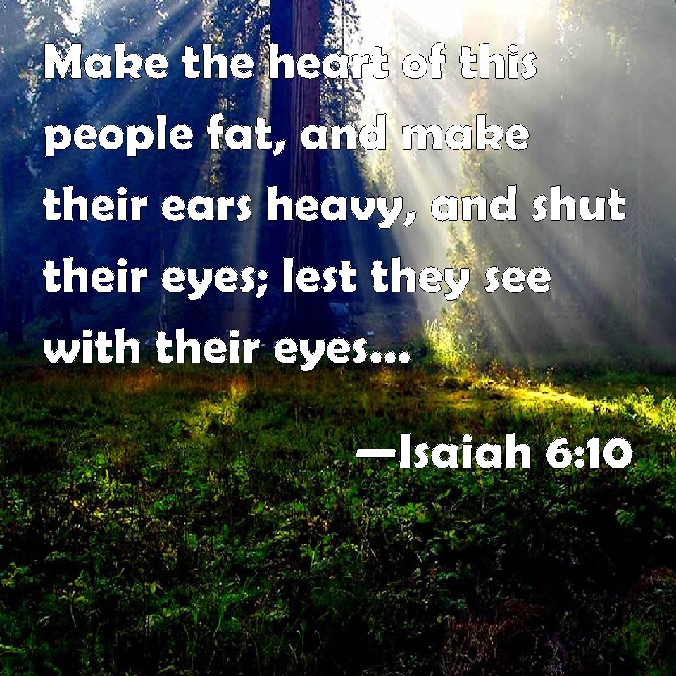 Choose a Background Isaiah 6:10 Make the heart of this people fat, and make their ears heavy, and shut their eyes; lest they see with their eyes, and hear with their ears, and understand with their heart, and convert, and be healed. KJV: Make the heart of this people fat, and make their ears heavy, and shut their eyes; lest they see with their eyes, and hear with their ears, and understand with their heart, and convert, and be healed. DRB: Blind the heart of this people, and make their ears heavy, and shut their eyes: lest they see with their eyes, and hear with their ears, and understand with their heart, and be converted and I heal them. DBT: Make the heart of this people fat, and make their ears heavy, and blind their eyes; lest they see with their eyes, and hear with their ears, and understand with their heart, and be converted, and healed. ERV: Make the heart of this people fat, and make their ears heavy, and shut their eyes; lest they see with their eyes, and hear with their ears, and understand with their heart, and turn again, and be healed. WBT: Make the heart of this people fat, and make their ears heavy, and shut their eyes; lest they see with their eyes, and hear with their ears, and understand with their heart, and convert, and be healed. WEB: Make the heart of this people fat. Make their ears heavy, and shut their eyes; lest they see with their eyes, and hear with their ears, and understand with their heart, and turn again, and be healed." YLT: Declare fat the heart of this people, And its ears declare heavy, And its eyes declare dazzled, Lest it see with its eyes, And with its ears hear, and its heart consider, And it hath turned back, and hath health.'Links Isaiah 6:10 NIV • Isaiah 6:10 NLT • Isaiah 6:10 ESV • Isaiah 6:10 NASB • Isaiah 6:10 KJV • Isaiah 6:10 Interlinear • Isaiah 6:10 Commentaries • Isaiah 6:10 Parallel Texts • Isaiah 6:10 Bible Apps • Isaiah 6:10 Parallel • Bible Hub |