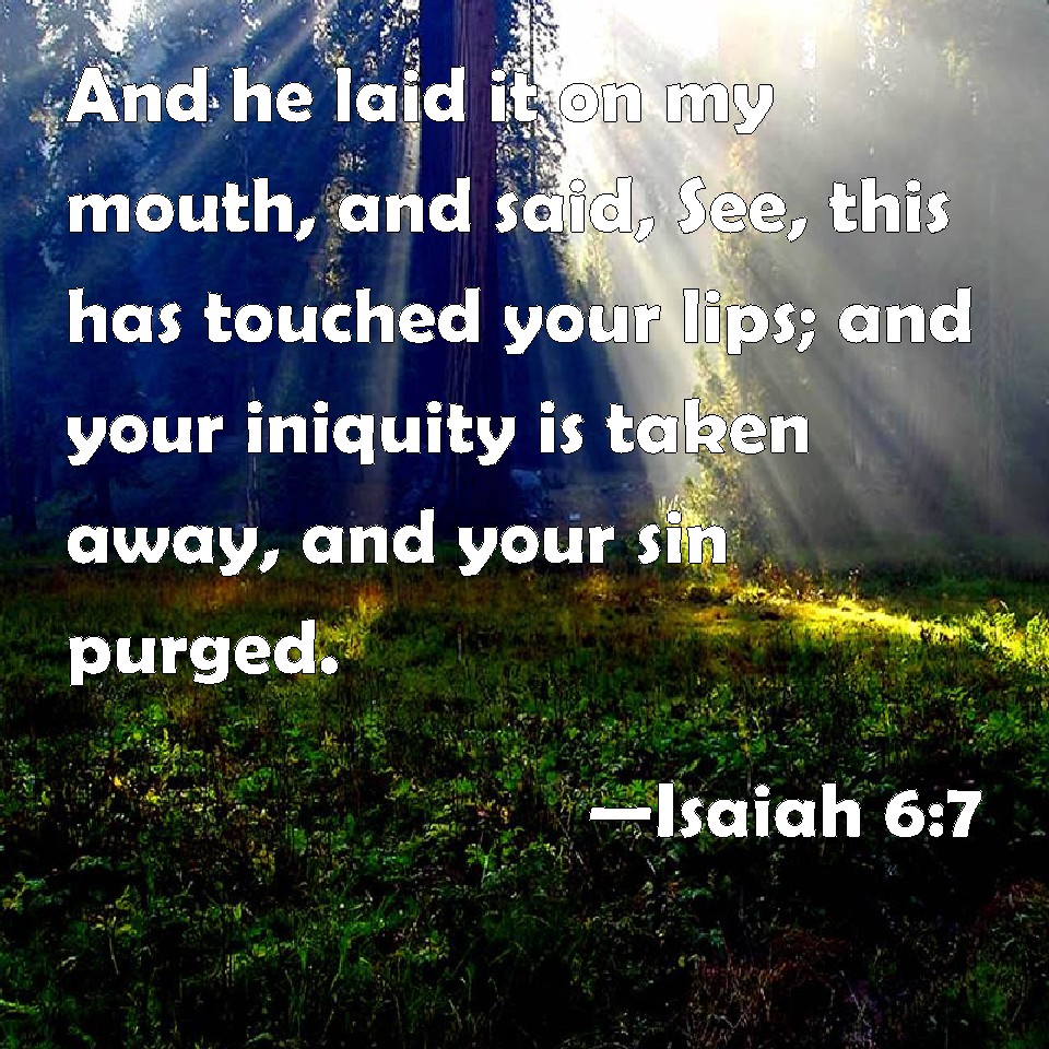 Choose a Background Isaiah 6:7 And he laid it on my mouth, and said, See, this has touched your lips; and your iniquity is taken away, and your sin purged. KJV: And he laid it upon my mouth, and said, Lo, this hath touched thy lips; and thine iniquity is taken away, and thy sin purged. DRB: And he touched my mouth, and said: Behold this hath touched thy lips, and thy iniquities shall be taken away, and thy sin shall be cleansed. DBT: and he made it touch my mouth, and said, Behold, this hath touched thy lips; and thine iniquity is taken away, and thy sin expiated. ERV: and he touched my mouth with it, and said, Lo, this hath touched thy lips; and thine iniquity is taken away, and thy sin purged. WBT: And he laid it upon my mouth, and said, Lo, this hath touched thy lips; and thy iniquity is taken away, and thy sin purged. WEB: He touched my mouth with it, and said, "Behold, this has touched your lips; and your iniquity is taken away, and your sin forgiven." YLT: and he striketh against my mouth, and saith: 'Lo, this hath stricken against thy lips, And turned aside is thine iniquity, And thy sin is covered.'Links Isaiah 6:7 NIV • Isaiah 6:7 NLT • Isaiah 6:7 ESV • Isaiah 6:7 NASB • Isaiah 6:7 KJV • Isaiah 6:7 Interlinear • Isaiah 6:7 Commentaries • Isaiah 6:7 Parallel Texts • Isaiah 6:7 Bible Apps • Isaiah 6:7 Parallel • Bible Hub |