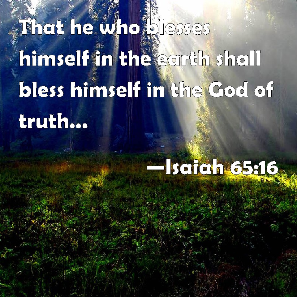 Choose a Background Isaiah 65:16 That he who blesses himself in the earth shall bless himself in the God of truth; and he that swears in the earth shall swear by the God of truth; because the former troubles are forgotten, and because they are hid from my eyes. KJV: That he who blesseth himself in the earth shall bless himself in the God of truth; and he that sweareth in the earth shall swear by the God of truth; because the former troubles are forgotten, and because they are hid from mine eyes. DRB: In which he that is blessed upon the earth, shall be blessed in God, amen: and he that sweareth in the earth, shall swear by God, amen: because the former distresses are forgotten, and because they are hid from my eyes. DBT: so that he who blesseth himself in the land shall bless himself by the God of truth; and he that sweareth in the land shall swear by the God of truth: because the former troubles shall be forgotten, and because they shall be hidden from mine eyes. ERV: so that he who blesseth himself in the earth shall bless himself in the God of truth; and he that sweareth in the earth shall swear by the God of truth; because the former troubles are forgotten, and because they are hid from mine eyes. WBT: That he who blesseth himself in the earth shall bless himself in the God of truth; and he that sweareth in the earth shall swear by the God of truth; because the former troubles are forgotten, and because they are hid from my eyes. WEB: so that he who blesses himself in the earth shall bless himself in the God of truth; and he who swears in the earth shall swear by the God of truth; because the former troubles are forgotten, and because they are hidden from my eyes. YLT: So that he who is blessing himself in the earth, Doth bless himself In the God of faithfulness, And he who is swearing in the earth, Doth swear by the God of faithfulness, Because the former distresses have been forgotten, And because they have been hid from Mine eyes.Links Isaiah 65:16 NIV • Isaiah 65:16 NLT • Isaiah 65:16 ESV • Isaiah 65:16 NASB • Isaiah 65:16 KJV • Isaiah 65:16 Interlinear • Isaiah 65:16 Commentaries • Isaiah 65:16 Parallel Texts • Isaiah 65:16 Bible Apps • Isaiah 65:16 Parallel • Bible Hub |