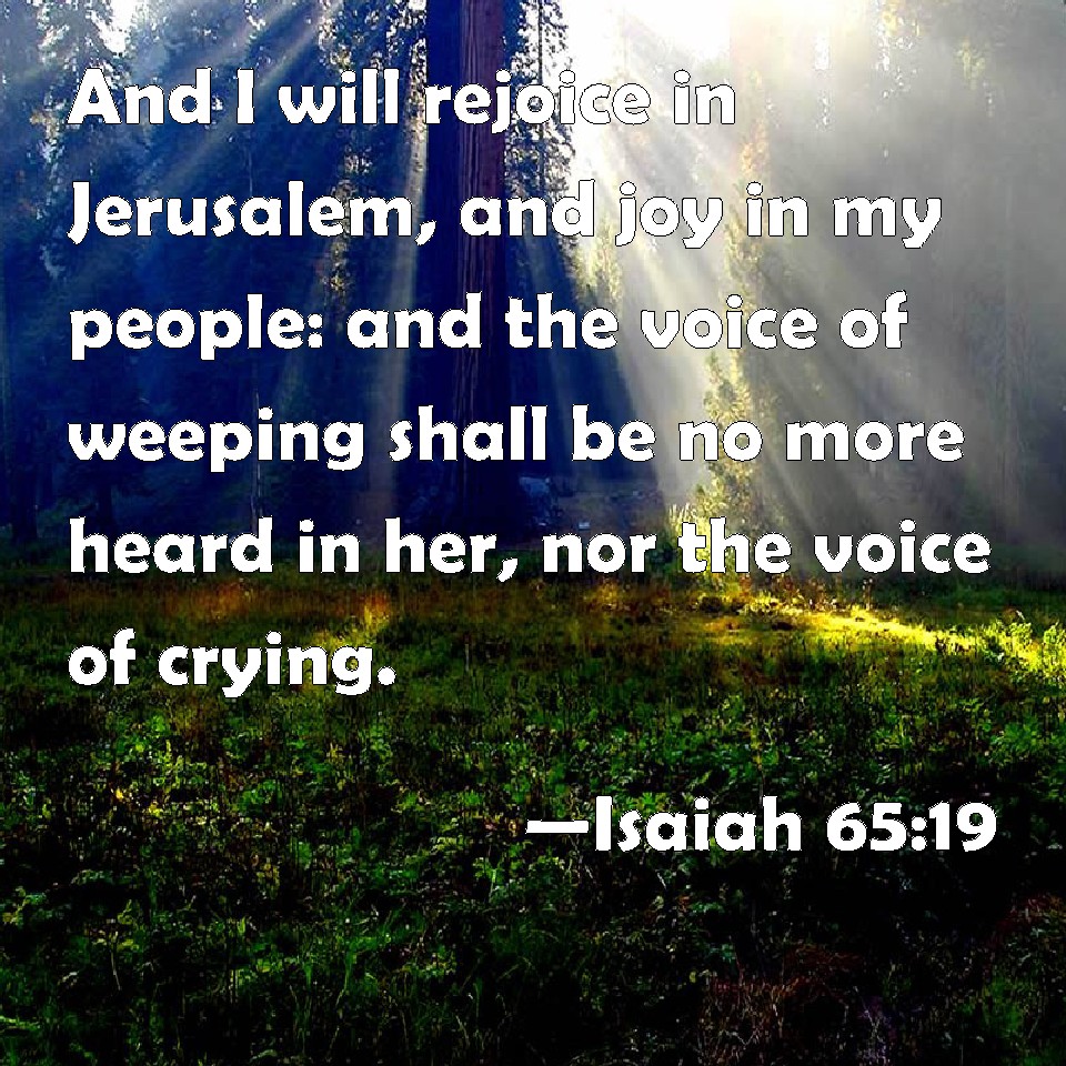 Choose a Background Isaiah 65:19 And I will rejoice in Jerusalem, and joy in my people: and the voice of weeping shall be no more heard in her, nor the voice of crying. KJV: And I will rejoice in Jerusalem, and joy in my people: and the voice of weeping shall be no more heard in her, nor the voice of crying. DRB: And I will rejoice in Jerusalem, and joy in my people, and the voice of weeping shall no more be heard in her, nor the voice of crying. DBT: And I will rejoice over Jerusalem, and will joy in my people; and the voice of weeping shall be no more heard in her, nor the voice of crying. ERV: And I will rejoice in Jerusalem, and joy in my people: and the voice of weeping shall be no more heard in her, nor the voice of crying. WBT: And I will rejoice in Jerusalem, and joy in my people: and the voice of weeping shall be no more heard in her, nor the voice of crying. WEB: I will rejoice in Jerusalem, and joy in my people; and there shall be heard in her no more the voice of weeping and the voice of crying. YLT: And I have rejoiced in Jerusalem, And have joyed in My people, And not heard in her any more Is the voice of weeping, and the voice of crying.Links Isaiah 65:19 NIV • Isaiah 65:19 NLT • Isaiah 65:19 ESV • Isaiah 65:19 NASB • Isaiah 65:19 KJV • Isaiah 65:19 Interlinear • Isaiah 65:19 Commentaries • Isaiah 65:19 Parallel Texts • Isaiah 65:19 Bible Apps • Isaiah 65:19 Parallel • Bible Hub |