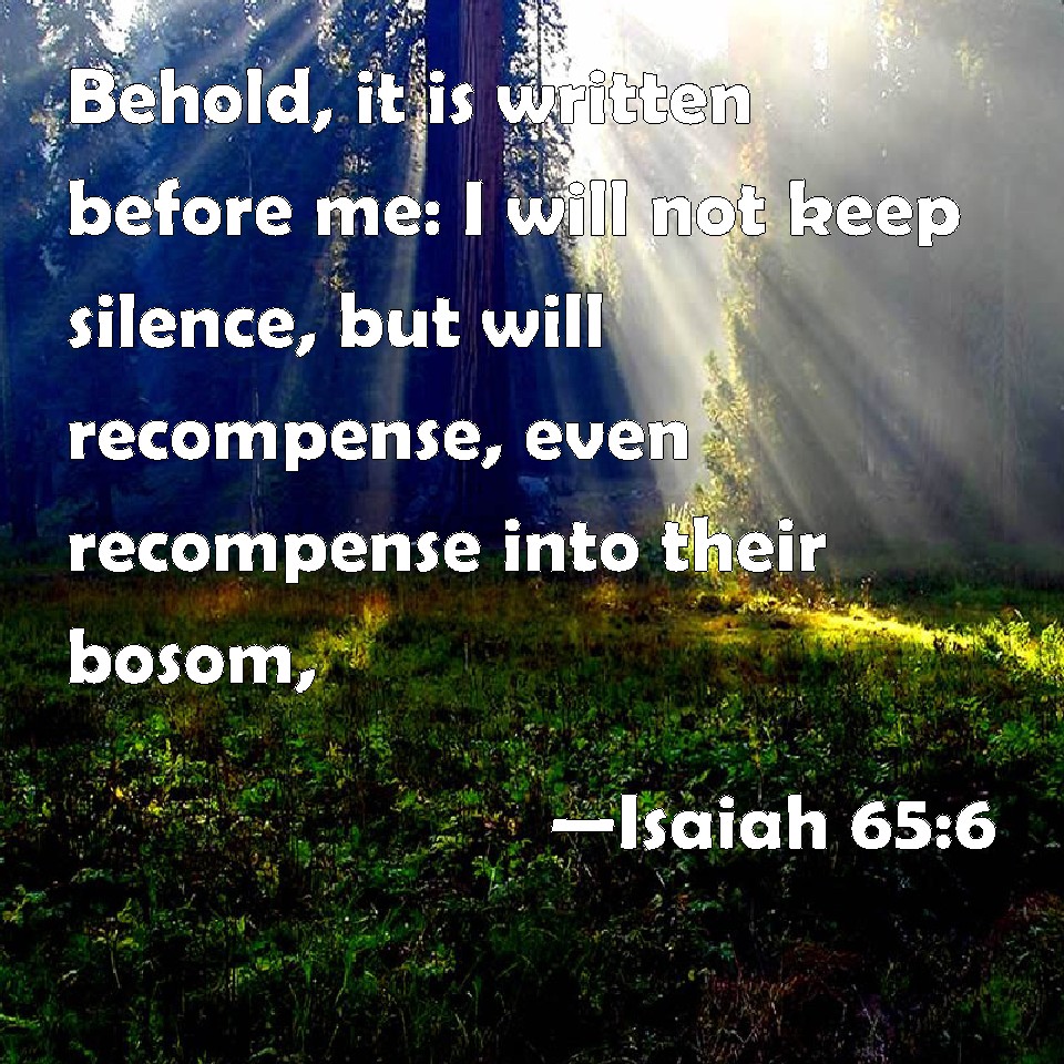 Choose a Background Isaiah 65:6 Behold, it is written before me: I will not keep silence, but will recompense, even recompense into their bosom, KJV: Behold, it is written before me: I will not keep silence, but will recompense, even recompense into their bosom, DRB: Behold it is written before me: I will not be silent, but I will render and repay into their bosom. DBT: Behold, it is written before me: I will not keep silence, but will recompense, even recompense into their bosom, ERV: Behold, it is written before me: I will not keep silence, but will recompense, yea, I will recompense into their bosom, WBT: Behold, it is written before me: I will not keep silence, but will recompense, even recompense into their bosom, WEB: "Behold, it is written before me: I will not keep silence, but will recompense, yes, I will recompense into their bosom, YLT: Lo, it is written before Me: 'I am not silent, but have recompensed; And I have recompensed into their bosom,Links Isaiah 65:6 NIV • Isaiah 65:6 NLT • Isaiah 65:6 ESV • Isaiah 65:6 NASB • Isaiah 65:6 KJV • Isaiah 65:6 Interlinear • Isaiah 65:6 Commentaries • Isaiah 65:6 Parallel Texts • Isaiah 65:6 Bible Apps • Isaiah 65:6 Parallel • Bible Hub |