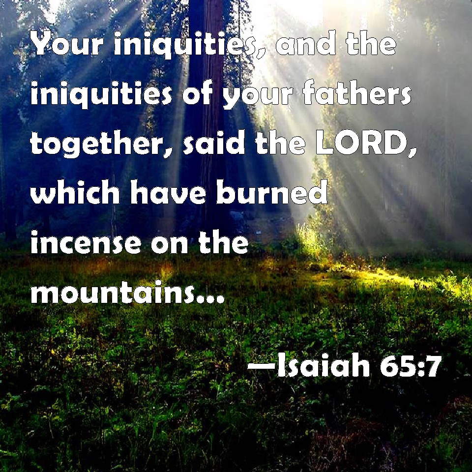 Choose a Background Isaiah 65:7 Your iniquities, and the iniquities of your fathers together, said the LORD, which have burned incense on the mountains, and blasphemed me on the hills: therefore will I measure their former work into their bosom. KJV: Your iniquities, and the iniquities of your fathers together, saith the LORD, which have burned incense upon the mountains, and blasphemed me upon the hills: therefore will I measure their former work into their bosom. DRB: Your iniquities, and the iniquities of your fathers together, saith the Lord, who have sacrificed upon the mountains, and have reproached me upon the hills; and I will measure back their first work in their bosom. DBT: your iniquities, and the iniquities of your fathers together, saith Jehovah, who have burned incense upon the mountains, and outraged me upon the hills; and I will measure their former work into their bosom. ERV: your own iniquities, and the iniquities of your fathers together, saith the LORD, which have burned incense upon the mountains, and blasphemed me upon the hills: therefore will I first measure their work into their bosom. WBT: Your iniquities, and the iniquities of your fathers together, saith the LORD, who have burned incense upon the mountains, and blasphemed me upon the hills: therefore will I measure their former work into their bosom. WEB: your own iniquities, and the iniquities of your fathers together," says Yahweh, "who have burned incense on the mountains, and blasphemed me on the hills; therefore will I first measure their work into their bosom." YLT: Your iniquities, and the iniquities of your fathers together, said Jehovah, Who have made perfume on the mountains, And on the heights have reproached Me, And I have measured their former work into their bosom.'Links Isaiah 65:7 NIV • Isaiah 65:7 NLT • Isaiah 65:7 ESV • Isaiah 65:7 NASB • Isaiah 65:7 KJV • Isaiah 65:7 Interlinear • Isaiah 65:7 Commentaries • Isaiah 65:7 Parallel Texts • Isaiah 65:7 Bible Apps • Isaiah 65:7 Parallel • Bible Hub |