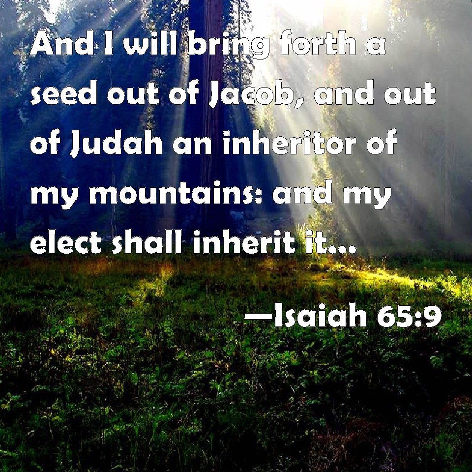 Choose a Background Isaiah 65:9 And I will bring forth a seed out of Jacob, and out of Judah an inheritor of my mountains: and my elect shall inherit it, and my servants shall dwell there. KJV: And I will bring forth a seed out of Jacob, and out of Judah an inheritor of my mountains: and mine elect shall inherit it, and my servants shall dwell there. DRB: And I will bring forth a seed out of Jacob, and out of Juda a possessor of my mountains: and my elect shall inherit it, and my servants shall dwell there. DBT: And I will bring forth a seed out of Jacob, and out of Judah a possessor of my mountains; and mine elect shall possess it, and my servants shall dwell there. ERV: And I will bring forth a seed out of Jacob, and out of Judah an inheritor of my mountains: and my chosen shall inherit it, and my servants shall dwell there. WBT: And I will bring forth a seed out of Jacob, and out of Judah an inheritor of my mountains: and my elect shall inherit it, and my servants shall dwell there. WEB: I will bring forth a seed out of Jacob, and out of Judah an inheritor of my mountains; and my chosen shall inherit it, and my servants shall dwell there. YLT: And I have brought out from Jacob a seed, And from Judah a possessor of My mount, And possess it do My chosen ones, And My servants do dwell there.Links Isaiah 65:9 NIV • Isaiah 65:9 NLT • Isaiah 65:9 ESV • Isaiah 65:9 NASB • Isaiah 65:9 KJV • Isaiah 65:9 Interlinear • Isaiah 65:9 Commentaries • Isaiah 65:9 Parallel Texts • Isaiah 65:9 Bible Apps • Isaiah 65:9 Parallel • Bible Hub |