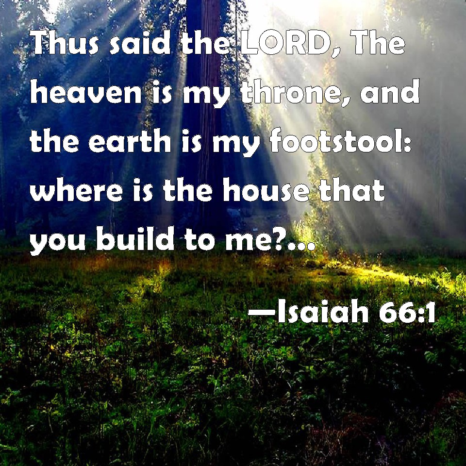 Choose a Background Isaiah 66:1 Thus said the LORD, The heaven is my throne, and the earth is my footstool: where is the house that you build to me? and where is the place of my rest? KJV: Thus saith the LORD, The heaven is my throne, and the earth is my footstool: where is the house that ye build unto me? and where is the place of my rest? DRB: THUS saith the Lord: Heaven is my throne, and the earth my footstool: what is this house that you will build to me? and what is this place of my rest? DBT: Thus saith Jehovah: The heavens are my throne, and the earth is my footstool: what is the house that ye will build unto me? and what is the place of my rest? ERV: Thus saith the LORD; The heaven is my throne, and the earth is my footstool: what manner of house will ye build unto me? and what place shall be my rest? WBT: Thus saith the LORD, The heaven is my throne, and the earth is my footstool: where is the house that ye build to me? and where is the place of my rest? WEB: Thus says Yahweh, "Heaven is my throne, and the earth is my footstool: what kind of house will you build to me? and what place shall be my rest? YLT: Thus said Jehovah: The heavens are My throne, And the earth My footstool, Where is this — the house that ye build for Me? And where is this — the place — My rest?Links Isaiah 66:1 NIV • Isaiah 66:1 NLT • Isaiah 66:1 ESV • Isaiah 66:1 NASB • Isaiah 66:1 KJV • Isaiah 66:1 Interlinear • Isaiah 66:1 Commentaries • Isaiah 66:1 Parallel Texts • Isaiah 66:1 Bible Apps • Isaiah 66:1 Parallel • Bible Hub |