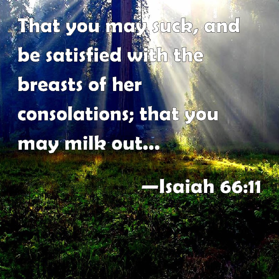 Choose a Background Isaiah 66:11 That you may suck, and be satisfied with the breasts of her consolations; that you may milk out, and be delighted with the abundance of her glory. KJV: That ye may suck, and be satisfied with the breasts of her consolations; that ye may milk out, and be delighted with the abundance of her glory. DRB: That you may suck, and be filled with the breasts of her consolations: that you may milk out, and flow with delights, from the abundance of her glory. DBT: because ye shall suck, and be satisfied with the breasts of her consolations; because ye shall drink out, and be delighted with the abundance of her glory. ERV: that ye may suck and be satisfied with the breasts of her consolations; that ye may milk out, and be delighted with the abundance of her glory. WBT: That ye may suck, and be satisfied with the breasts of her consolations; that ye may draw milk, and be delighted with the abundance of her glory. WEB: that you may nurse and be satisfied at the comforting breasts; that you may drink deeply, and be delighted with the abundance of her glory." YLT: So that ye suck, and have been satisfied, From the breast of her consolations, So that ye wring out, and have delighted yourselves From the abundance of her honour.Links Isaiah 66:11 NIV • Isaiah 66:11 NLT • Isaiah 66:11 ESV • Isaiah 66:11 NASB • Isaiah 66:11 KJV • Isaiah 66:11 Interlinear • Isaiah 66:11 Commentaries • Isaiah 66:11 Parallel Texts • Isaiah 66:11 Bible Apps • Isaiah 66:11 Parallel • Bible Hub |