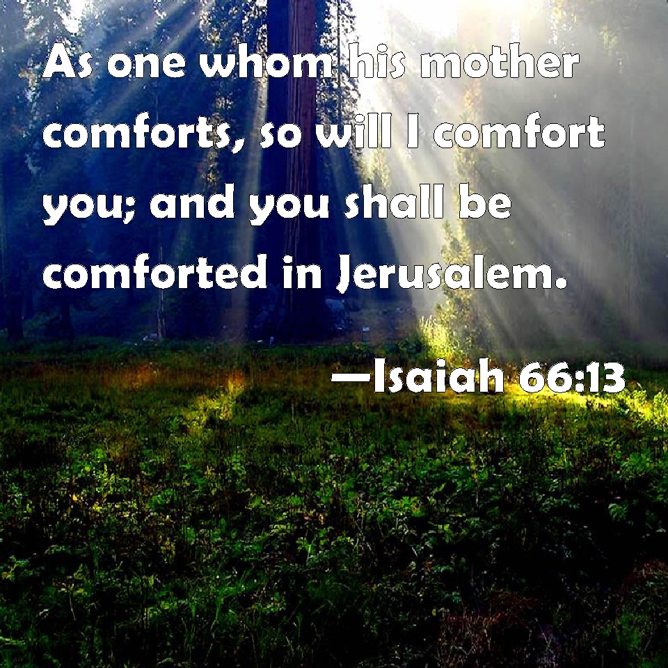 Choose a Background Isaiah 66:13 As one whom his mother comforts, so will I comfort you; and you shall be comforted in Jerusalem. KJV: As one whom his mother comforteth, so will I comfort you; and ye shall be comforted in Jerusalem. DRB: As one whom the mother caresseth, so will I comfort you, and you shall be comforted in Jerusalem. DBT: As one whom his mother comforteth, so will I comfort you; and ye shall be comforted in Jerusalem. ERV: As one whom his mother comforteth, so will I comfort you; and ye shall be comforted in Jerusalem. WBT: As one whom his mother comforteth, so will I comfort you; and ye shall be comforted in Jerusalem. WEB: As one whom his mother comforts, so will I comfort you; and you will be comforted in Jerusalem." YLT: As one whom his mother comforteth, so do I comfort you, Yea, in Jerusalem ye are comforted.Links Isaiah 66:13 NIV • Isaiah 66:13 NLT • Isaiah 66:13 ESV • Isaiah 66:13 NASB • Isaiah 66:13 KJV • Isaiah 66:13 Interlinear • Isaiah 66:13 Commentaries • Isaiah 66:13 Parallel Texts • Isaiah 66:13 Bible Apps • Isaiah 66:13 Parallel • Bible Hub |