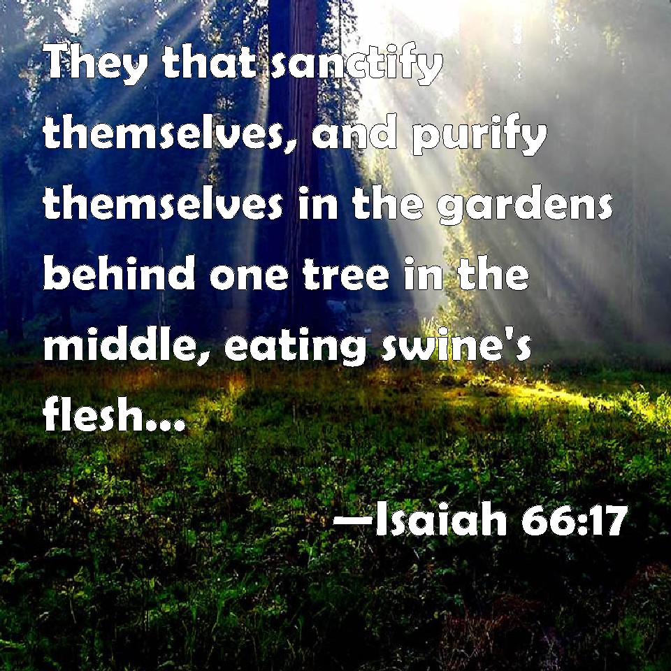 Choose a Background Isaiah 66:17 They that sanctify themselves, and purify themselves in the gardens behind one tree in the middle, eating swine's flesh, and the abomination, and the mouse, shall be consumed together, said the LORD. KJV: They that sanctify themselves, and purify themselves in the gardens behind one tree in the midst, eating swine's flesh, and the abomination, and the mouse, shall be consumed together, saith the LORD. DRB: They that were sanctified, and thought themselves clean in the gardens behind the gate within, they that did eat swine's flesh, and the abomination, and the mouse: they shall be consumed together, saith the Lord. DBT: They that sanctify themselves, and purify themselves in the gardens behind one in the midst; that eat swine's flesh, and the abomination, and the mouse, shall perish together, saith Jehovah. ERV: They that sanctify themselves and purify themselves to go unto the gardens, behind one in the midst, eating swine's flesh, and the abomination, and the mouse; they shall come to an end together, saith the LORD. WBT: They that sanctify themselves, and purify themselves in the gardens behind one tree in the midst, eating swine's flesh, and the abomination, and the mouse, shall be consumed together, saith the LORD. WEB: "Those who sanctify themselves and purify themselves [to go] to the gardens, behind one in the midst, eating pig's flesh, and the abomination, and the mouse, they shall come to an end together," says Yahweh. YLT: Those sanctifying and cleansing themselves at the gardens, After Ahad in the midst, Eating flesh of the sow, And of the abomination, and of the mouse, Together are consumed, An affirmation of Jehovah.Links Isaiah 66:17 NIV • Isaiah 66:17 NLT • Isaiah 66:17 ESV • Isaiah 66:17 NASB • Isaiah 66:17 KJV • Isaiah 66:17 Interlinear • Isaiah 66:17 Commentaries • Isaiah 66:17 Parallel Texts • Isaiah 66:17 Bible Apps • Isaiah 66:17 Parallel • Bible Hub |