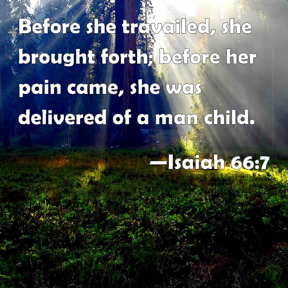 Choose a Background Isaiah 66:7 Before she travailed, she brought forth; before her pain came, she was delivered of a man child. KJV: Before she travailed, she brought forth; before her pain came, she was delivered of a man child. DRB: Before she was in labour, she brought forth; before her time came to be delivered, she brought forth a man child. DBT: Before she travailed, she brought forth; before her pain came, she was delivered of a man-child. ERV: Before she travailed, she brought forth; before her pain came, she was delivered of a man child. WBT: Before she travailed, she brought forth; before her pain came, she was delivered of a male child. WEB: "Before she travailed, she brought forth; before her pain came, she delivered a son. YLT: Before she is pained she hath brought forth, Before a pang cometh to her, She hath delivered a male.Links Isaiah 66:7 NIV • Isaiah 66:7 NLT • Isaiah 66:7 ESV • Isaiah 66:7 NASB • Isaiah 66:7 KJV • Isaiah 66:7 Interlinear • Isaiah 66:7 Commentaries • Isaiah 66:7 Parallel Texts • Isaiah 66:7 Bible Apps • Isaiah 66:7 Parallel • Bible Hub |
