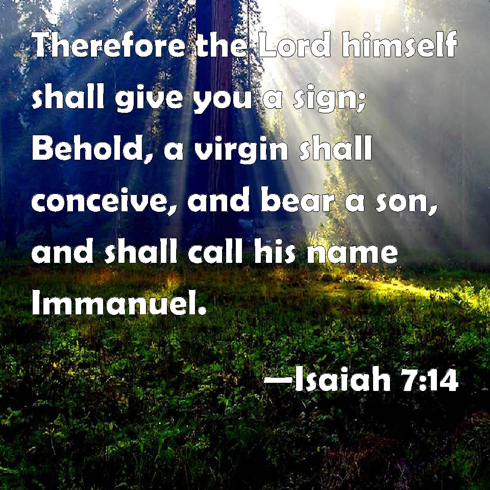 Choose a Background Isaiah 7:14 Therefore the Lord himself shall give you a sign; Behold, a virgin shall conceive, and bear a son, and shall call his name Immanuel. KJV: Therefore the Lord himself shall give you a sign; Behold, a virgin shall conceive, and bear a son, and shall call his name Immanuel. DRB: Therefore the Lord himself shall give you a sign. Behold a virgin shall conceive, and bear a son, and his name shall be called Emmanuel. DBT: Therefore will the Lord himself give you a sign: Behold, the virgin shall conceive and shall bring forth a son, and call his name Immanuel. ERV: Therefore the Lord himself shall give you a sign; behold, a virgin shall conceive, and bear a son, and shall call his name Immanuel. WBT: Therefore the Lord himself will give you a sign; Behold, a virgin shall conceive, and bear a son, and shall call his name Immanuel. WEB: Therefore the Lord himself will give you a sign. Behold, the virgin will conceive, and bear a son, and shall call his name Immanuel. YLT: Therefore the Lord Himself giveth to you a sign, Lo, the Virgin is conceiving, And is bringing forth a son, And hath called his name Immanuel,Links Isaiah 7:14 NIV • Isaiah 7:14 NLT • Isaiah 7:14 ESV • Isaiah 7:14 NASB • Isaiah 7:14 KJV • Isaiah 7:14 Interlinear • Isaiah 7:14 Commentaries • Isaiah 7:14 Parallel Texts • Isaiah 7:14 Bible Apps • Isaiah 7:14 Parallel • Bible Hub |
