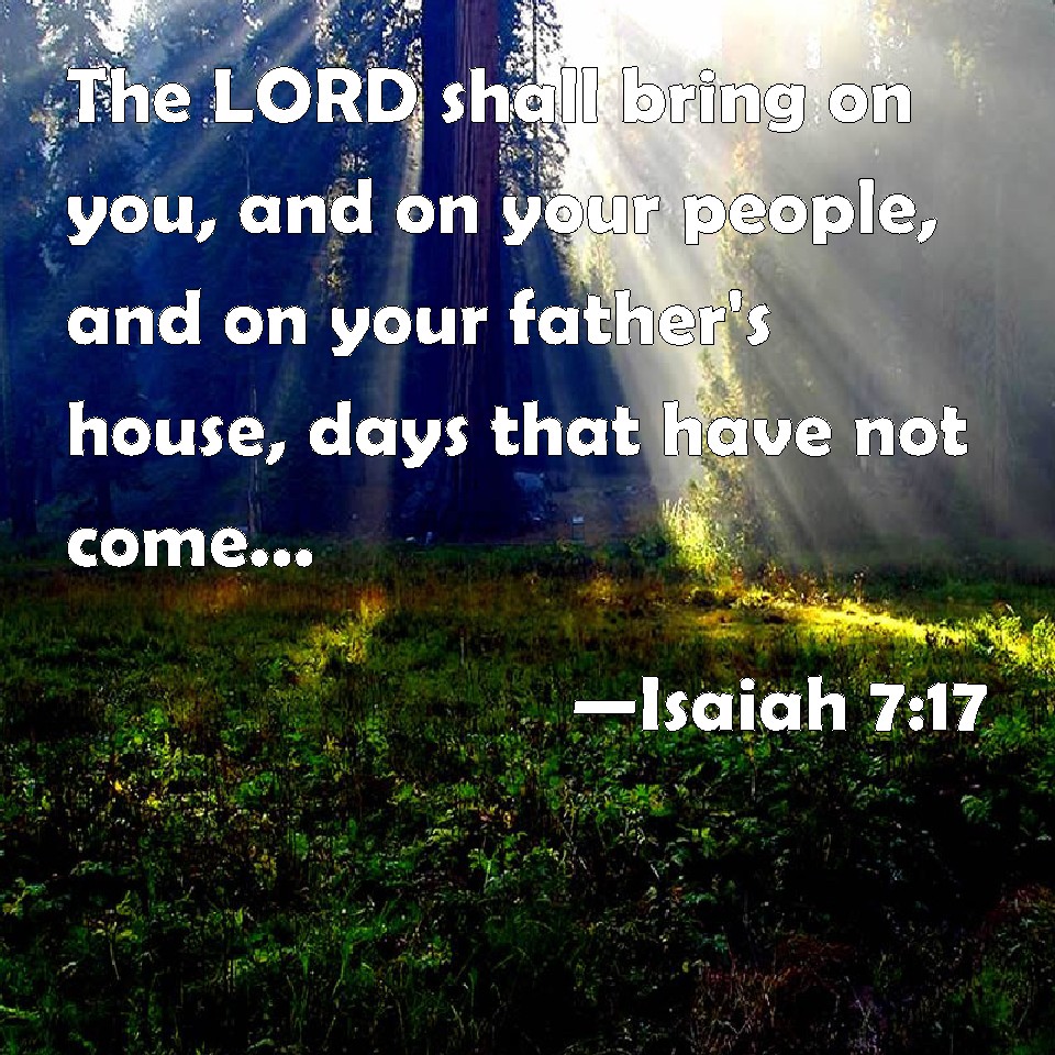 Choose a Background Isaiah 7:17 The LORD shall bring on you, and on your people, and on your father's house, days that have not come, from the day that Ephraim departed from Judah; even the king of Assyria. KJV: The LORD shall bring upon thee, and upon thy people, and upon thy father's house, days that have not come, from the day that Ephraim departed from Judah; even the king of Assyria. DRB: The Lord shall bring upon thee, and upon thy people, and upon the house of thy father, days that have not come since the time of the separation of Ephraim from Juda with the king of the Assyrians. DBT: Jehovah will bring upon thee, and upon thy people, and upon thy father's house, days which have not come since the day when Ephraim turned away from Judah even the king of Assyria. ERV: The LORD shall bring upon thee, and upon thy people, and upon thy father's house, days that have not come, from the day that Ephraim departed from Judah; even the king of Assyria. WBT: The LORD will bring upon thee, and upon thy people, and upon thy father's house, days that have not come, from the day that Ephraim departed from Judah; even the king of Assyria. WEB: Yahweh will bring on you, on your people, and on your father's house, days that have not come, from the day that Ephraim departed from Judah; even the king of Assyria. YLT: Jehovah bringeth on thee, and on thy people, And on the house of thy father, Days that have not come, Even from the day of the turning aside of Ephraim from Judah, By the king of Asshur.Links Isaiah 7:17 NIV • Isaiah 7:17 NLT • Isaiah 7:17 ESV • Isaiah 7:17 NASB • Isaiah 7:17 KJV • Isaiah 7:17 Interlinear • Isaiah 7:17 Commentaries • Isaiah 7:17 Parallel Texts • Isaiah 7:17 Bible Apps • Isaiah 7:17 Parallel • Bible Hub |