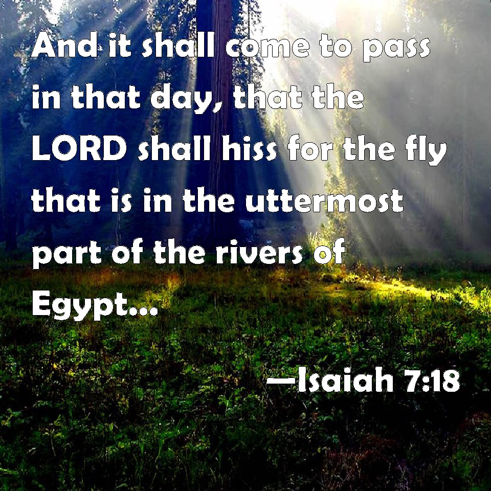 Choose a Background Isaiah 7:18 And it shall come to pass in that day, that the LORD shall hiss for the fly that is in the uttermost part of the rivers of Egypt, and for the bee that is in the land of Assyria. KJV: And it shall come to pass in that day, that the LORD shall hiss for the fly that is in the uttermost part of the rivers of Egypt, and for the bee that is in the land of Assyria. DRB: And it shall come to pass in that day, that the Lord shall hiss for the fly, that is in the uttermost parts of the rivers of Egypt, and for the bee that is in the land of Assyria. DBT: And it shall come to pass in that day, that Jehovah will hiss for the fly which is at the extremity of the streams of Egypt, and for the bee which is in the land of Assyria; ERV: And it shall come to pass in that day, that the LORD shall hiss for the fly that is in the uttermost part of the rivers of Egypt, and for the bee that is in the land of Assyria. WBT: And it shall come to pass in that day, that the LORD will hiss for the fly that is in the uttermost part of the rivers of Egypt, and for the bee that is in the land of Assyria. WEB: It will happen in that day that Yahweh will whistle for the fly that is in the uttermost part of the rivers of Egypt, and for the bee that is in the land of Assyria. YLT: And it hath come to pass, in that day, Jehovah doth hiss for a fly that is in the extremity of the brooks of Egypt, And for a bee that is in the land of Asshur.Links Isaiah 7:18 NIV • Isaiah 7:18 NLT • Isaiah 7:18 ESV • Isaiah 7:18 NASB • Isaiah 7:18 KJV • Isaiah 7:18 Interlinear • Isaiah 7:18 Commentaries • Isaiah 7:18 Parallel Texts • Isaiah 7:18 Bible Apps • Isaiah 7:18 Parallel • Bible Hub |