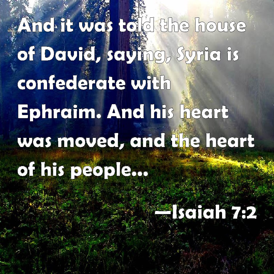 Choose a Background Isaiah 7:2 And it was told the house of David, saying, Syria is confederate with Ephraim. And his heart was moved, and the heart of his people, as the trees of the wood are moved with the wind. KJV: And it was told the house of David, saying, Syria is confederate with Ephraim. And his heart was moved, and the heart of his people, as the trees of the wood are moved with the wind. DRB: And they told the house of David, saying: Syria hath rested upon Ephraim, and his heart was moved, and the heart of his people, as the trees of the woods are moved with the wind. DBT: And it was told the house of David saying, Syria is allied with Ephraim. Then his heart and the heart of his people shook, as the trees of the forest are shaken with the wind. ERV: And it was told the house of David, saying, Syria is confederate with Ephraim. And his heart was moved, and the heart of his people, as the trees of the forest are moved with the wind. WBT: And it was told the house of David, saying, Syria is confederate with Ephraim. And his heart was moved, and the heart of his people, as the trees of the wood are moved with the wind. WEB: It was told the house of David, saying, "Syria is allied with Ephraim." His heart trembled, and the heart of his people, as the trees of the forest tremble with the wind. YLT: And it is declared to the house of David, saying, 'Aram hath been led towards Ephraim,' And his heart and the heart of his people is moved, like the moving of trees of a forest by the presence of wind.Links Isaiah 7:2 NIV • Isaiah 7:2 NLT • Isaiah 7:2 ESV • Isaiah 7:2 NASB • Isaiah 7:2 KJV • Isaiah 7:2 Interlinear • Isaiah 7:2 Commentaries • Isaiah 7:2 Parallel Texts • Isaiah 7:2 Bible Apps • Isaiah 7:2 Parallel • Bible Hub |
