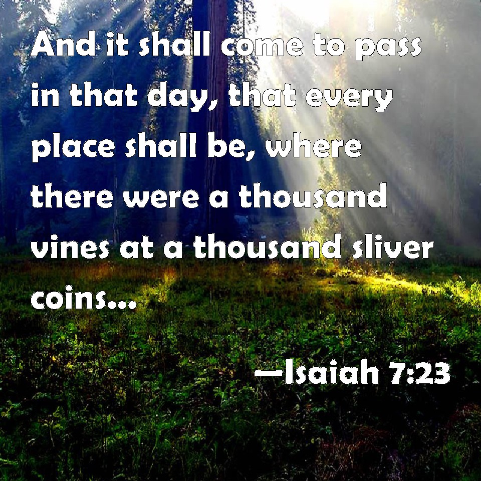 Choose a Background Isaiah 7:23 And it shall come to pass in that day, that every place shall be, where there were a thousand vines at a thousand sliver coins, it shall even be for briers and thorns. KJV: And it shall come to pass in that day, that every place shall be, where there were a thousand vines at a thousand silverlings, it shall even be for briers and thorns. DRB: And it shall come to pass in that day, that every place where there were a thousand vines, at a thousand pieces of silver, shall become thorns and briers. DBT: And it shall come to pass in that day, that every place, where there were a thousand vines at a thousand silver pieces, shall become briars and thorns: ERV: And it shall come to pass in that day, that every place, where there were a thousand vines at a thousand silverlings, shall even be for briers and thorns. WBT: And it shall come to pass in that day, that every place shall be, where there were a thousand vines at a thousand pieces of silver, it shall even be for briers and thorns. WEB: It will happen in that day that every place where there were a thousand vines at a thousand silver shekels, shall be for briers and thorns. YLT: And it hath come to pass, in that day, Every place where there are a thousand vines, At a thousand silverlings, Is for briers and for thorns.Links Isaiah 7:23 NIV • Isaiah 7:23 NLT • Isaiah 7:23 ESV • Isaiah 7:23 NASB • Isaiah 7:23 KJV • Isaiah 7:23 Interlinear • Isaiah 7:23 Commentaries • Isaiah 7:23 Parallel Texts • Isaiah 7:23 Bible Apps • Isaiah 7:23 Parallel • Bible Hub |