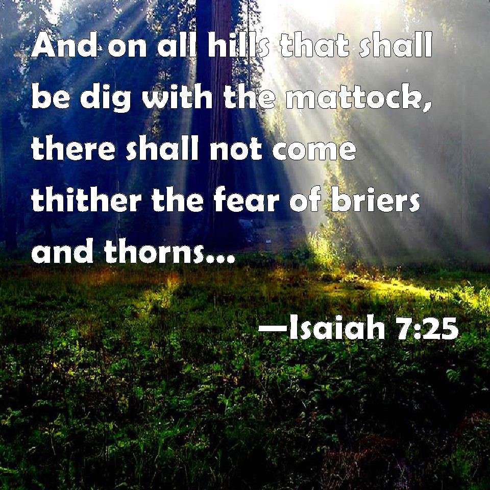 Choose a Background Isaiah 7:25 And on all hills that shall be dig with the mattock, there shall not come thither the fear of briers and thorns: but it shall be for the sending forth of oxen, and for the treading of lesser cattle. KJV: And on all hills that shall be digged with the mattock, there shall not come thither the fear of briers and thorns: but it shall be for the sending forth of oxen, and for the treading of lesser cattle. DRB: And as for all the hills that shall be raked with a rake, the fear of thorns and briers shall not come thither, but they shall be for the ox to feed on, and the lesser cattle to tread upon. DBT: And all mountains that have been dug up with the hoe thither will they not come, from fear of briars and thorns; and they shall be for the sending forth of oxen, and for the treading of small cattle. ERV: And all the hills that were digged with the mattock; thou shalt not come thither for fear of briers and thorns, but it shall be for the sending forth of oxen, and for the treading of sheep. WBT: And on all hills that shall be digged with the mattock, there shall not come thither the fear of briers and thorns: but it shall be for the sending forth of oxen, and for the treading of lesser cattle. WEB: All the hills that were cultivated with the hoe, you shall not come there for fear of briers and thorns; but it shall be for the sending forth of oxen, and for the treading of sheep." YLT: And all the hills that with a mattock are kept in order, Thither cometh not the fear of brier and thorn, And it hath been for the sending forth of ox, And for the treading of sheep!'Links Isaiah 7:25 NIV • Isaiah 7:25 NLT • Isaiah 7:25 ESV • Isaiah 7:25 NASB • Isaiah 7:25 KJV • Isaiah 7:25 Interlinear • Isaiah 7:25 Commentaries • Isaiah 7:25 Parallel Texts • Isaiah 7:25 Bible Apps • Isaiah 7:25 Parallel • Bible Hub |