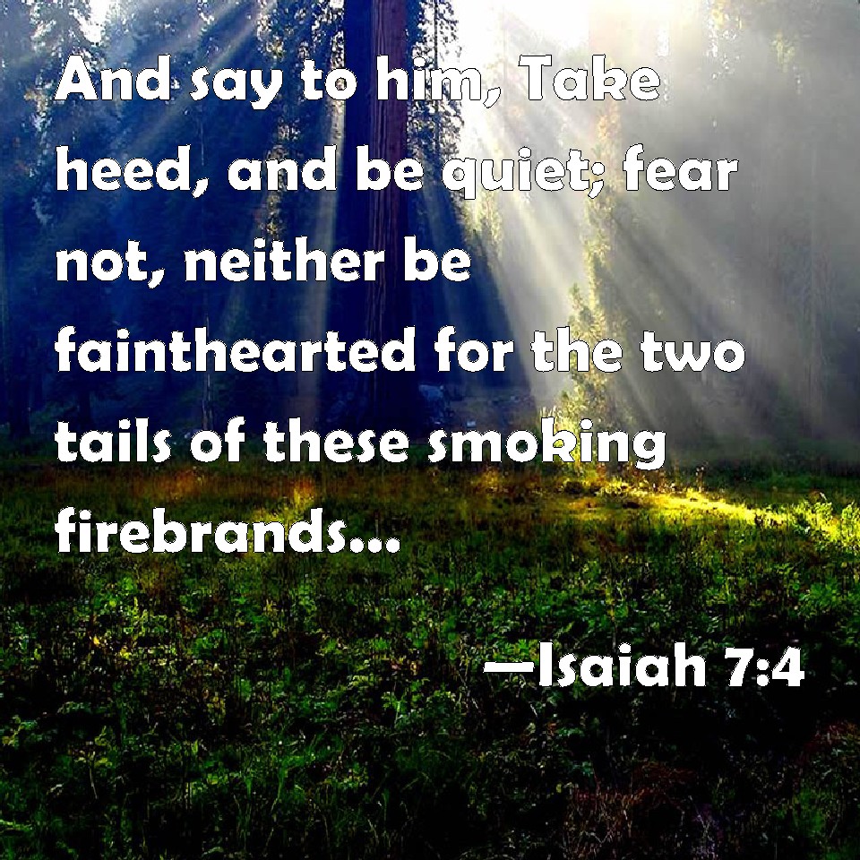 Choose a Background Isaiah 7:4 And say to him, Take heed, and be quiet; fear not, neither be fainthearted for the two tails of these smoking firebrands, for the fierce anger of Rezin with Syria, and of the son of Remaliah. KJV: And say unto him, Take heed, and be quiet; fear not, neither be fainthearted for the two tails of these smoking firebrands, for the fierce anger of Rezin with Syria, and of the son of Remaliah. DRB: And thou shalt say to him: See thou be quiet: fear not, and let not thy heart be afraid of the two tails of these fire brands, smoking with the wrath of the fury of Rasin king of Syria, end of the son of Romelia. DBT: and thou shalt say unto him, Take heed and be quiet; fear not, and let not thy heart faint before these two ends of smoking firebrands, because of the fierce anger of Rezin and Syria, and of the son of Remaliah. ERV: and say unto him, Take heed, and be quiet; fear not, neither let thine heart be faint, because of these two tails of smoking firebrands, for the fierce anger of Rezin and Syria, and of the son of Remaliah. WBT: And say to him, Take heed, and be quiet; fear not, neither be faint-hearted for the two tails of these smoking fire-brands, for the fierce anger of Rezin with Syria, and of the son of Remaliah. WEB: Tell him, 'Be careful, and keep calm. Don't be afraid, neither let your heart be faint because of these two tails of smoking torches, for the fierce anger of Rezin and Syria, and of the son of Remaliah. YLT: and thou hast said unto him: 'Take heed, and be quiet, fear not, And let not thy heart be timid, Because of these two tails of smoking brands, For the fierceness of the anger of Rezin and Aram, And the son of Remaliah.Links Isaiah 7:4 NIV • Isaiah 7:4 NLT • Isaiah 7:4 ESV • Isaiah 7:4 NASB • Isaiah 7:4 KJV • Isaiah 7:4 Interlinear • Isaiah 7:4 Commentaries • Isaiah 7:4 Parallel Texts • Isaiah 7:4 Bible Apps • Isaiah 7:4 Parallel • Bible Hub |