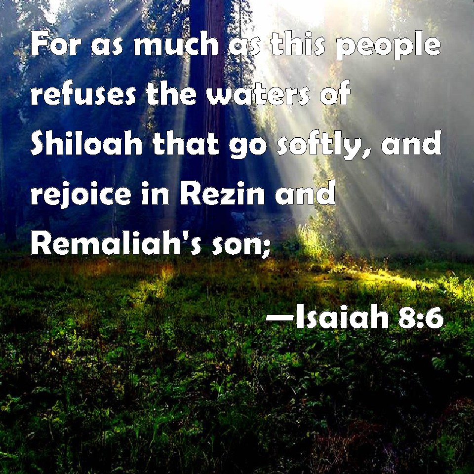 Choose a Background Isaiah 8:6 For as much as this people refuses the waters of Shiloah that go softly, and rejoice in Rezin and Remaliah's son; KJV: Forasmuch as this people refuseth the waters of Shiloah that go softly, and rejoice in Rezin and Remaliah's son; DRB: Forasmuch as this people hath cast away the waters of Siloe, that go with silence, and hath rather taken Basin, and the son of Romelia: DBT: Forasmuch as this people refuseth the waters of Shiloah which flow softly, and rejoiceth in Rezin and in the son of Remaliah, ERV: Forasmuch as this people hath refused the waters of Shiloah that go softly, and rejoice in Rezin and Remaliah's son; WBT: Forasmuch as this people refuseth the waters of Shiloah that flow gently, and rejoice in Rezin and Remaliah's son; WEB: "Because this people have refused the waters of Shiloah that go softly, and rejoice in Rezin and Remaliah's son; YLT: 'Because that this people hath refused The waters of Shiloah that go softly, And is rejoicing with Rezin and the son of Remaliah,Links Isaiah 8:6 NIV • Isaiah 8:6 NLT • Isaiah 8:6 ESV • Isaiah 8:6 NASB • Isaiah 8:6 KJV • Isaiah 8:6 Interlinear • Isaiah 8:6 Commentaries • Isaiah 8:6 Parallel Texts • Isaiah 8:6 Bible Apps • Isaiah 8:6 Parallel • Bible Hub |