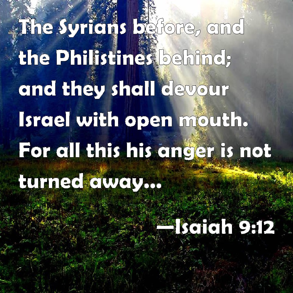 Choose a Background Isaiah 9:12 The Syrians before, and the Philistines behind; and they shall devour Israel with open mouth. For all this his anger is not turned away, but his hand is stretched out still. KJV: The Syrians before, and the Philistines behind; and they shall devour Israel with open mouth. For all this his anger is not turned away, but his hand is stretched out still. DRB: The Syrians from the east, and the Philistines from the west: and they shall devour Israel with open mouth, For all this his indignation is not turned away, but his hand is stretched out still. DBT: the Syrians on the east, and the Philistines on the west; and they shall devour Israel with open mouth. For all this his anger is not turned away, and his hand is stretched out still. ERV: the Syrians before, and the Philistines behind, and they shall devour Israel with open mouth. For all this his anger is not turned away, but his hand is stretched out still. WBT: The Syrians before, and the Philistines behind; and they shall devour Israel with open mouth. For all this his anger is not turned away, but his hand is stretched out still. WEB: The Syrians in front, and the Philistines behind; and they will devour Israel with open mouth. For all this, his anger is not turned away, but his hand is stretched out still. YLT: Aram from before, and Philistia from behind, And they devour Israel with the whole mouth. With all this not turned back hath His anger, And still His hand is stretched out.Links Isaiah 9:12 NIV • Isaiah 9:12 NLT • Isaiah 9:12 ESV • Isaiah 9:12 NASB • Isaiah 9:12 KJV • Isaiah 9:12 Interlinear • Isaiah 9:12 Commentaries • Isaiah 9:12 Parallel Texts • Isaiah 9:12 Bible Apps • Isaiah 9:12 Parallel • Bible Hub |
