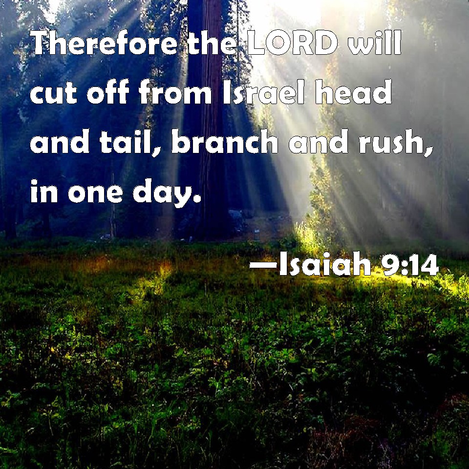 Choose a Background Isaiah 9:14 Therefore the LORD will cut off from Israel head and tail, branch and rush, in one day. KJV: Therefore the LORD will cut off from Israel head and tail, branch and rush, in one day. DRB: And the Lord shall destroy out of Israel the head and the tail, him that bendeth down, and him that holdeth back, in one day. DBT: And Jehovah will cut off from Israel head and tail, palm-branch and rush, in one day: ERV: Therefore the LORD will cut off from Israel head and tail, palm-branch and rush, in one day. WBT: Therefore the LORD will cut off from Israel head and tail, branch and rush, in one day. WEB: Therefore Yahweh will cut off from Israel head and tail, palm branch and reed, in one day. YLT: And Jehovah cutteth off from Israel head and tail, Branch and reed — the same day,Links Isaiah 9:14 NIV • Isaiah 9:14 NLT • Isaiah 9:14 ESV • Isaiah 9:14 NASB • Isaiah 9:14 KJV • Isaiah 9:14 Interlinear • Isaiah 9:14 Commentaries • Isaiah 9:14 Parallel Texts • Isaiah 9:14 Bible Apps • Isaiah 9:14 Parallel • Bible Hub |