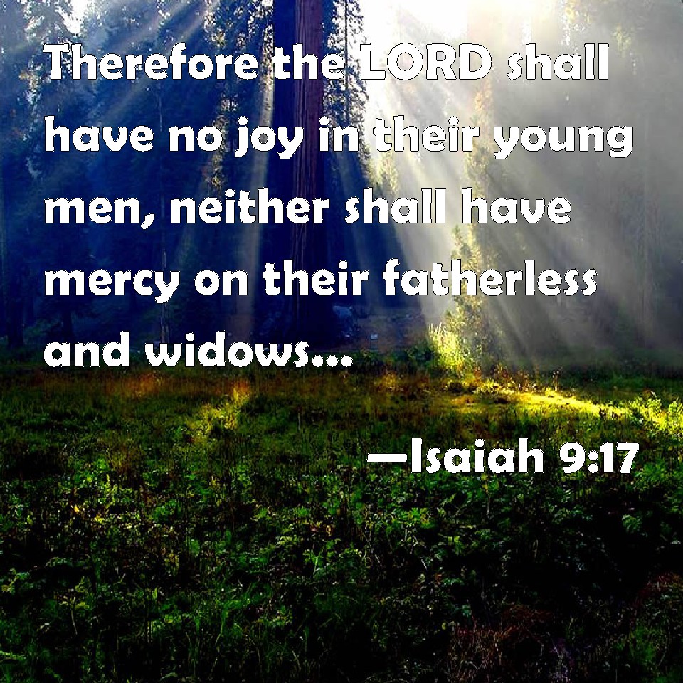 Choose a Background Isaiah 9:17 Therefore the LORD shall have no joy in their young men, neither shall have mercy on their fatherless and widows: for every one is an hypocrite and an evildoer, and every mouth speaks folly. For all this his anger is not turned away, but his hand is stretched out still. KJV: Therefore the Lord shall have no joy in their young men, neither shall have mercy on their fatherless and widows: for every one is an hypocrite and an evildoer, and every mouth speaketh folly. For all this his anger is not turned away, but his hand is stretched out still. DRB: Therefore the Lord shell have no joy in their young men: neither shall he have mercy on their fatherless, and widows: for every one is a hypocrite and wicked, and every mouth hath spoken folly. For all this his indignation is not turned away, but his bend is stretched out still. DBT: Therefore the Lord will not rejoice in their young men, neither will he have mercy on their fatherless and on their widows; for every one is a hypocrite and an evildoer, and every mouth speaketh folly. For all this his anger is not turned away, and his hand is stretched out still. ERV: Therefore the Lord shall not rejoice over their young men, neither shall he have compassion on their fatherless and widows: for every one is profane and an evil-doer, and every mouth speaketh folly. For all this his anger is not turned away, but his hand is stretched out still. WBT: Therefore the Lord will have no joy in their young men, neither will have mercy on their fatherless and widows: for every one is a hypocrite and an evil-doer, and every mouth speaketh folly. For all this his anger is not turned away, but his hand is stretched out still. WEB: Therefore the Lord will not rejoice over their young men, neither will he have compassion on their fatherless and widows; for everyone is profane and an evildoer, and every mouth speaks folly. For all this his anger is not turned away, but his hand is stretched out still. YLT: Therefore, over its young men the Lord rejoiceth not, And its orphans, and its widows He pitieth not, For every one is profane, and an evil doer, And every mouth is speaking folly. With all this not turned back hath His anger, And still His hand is stretched out.Links Isaiah 9:17 NIV • Isaiah 9:17 NLT • Isaiah 9:17 ESV • Isaiah 9:17 NASB • Isaiah 9:17 KJV • Isaiah 9:17 Interlinear • Isaiah 9:17 Commentaries • Isaiah 9:17 Parallel Texts • Isaiah 9:17 Bible Apps • Isaiah 9:17 Parallel • Bible Hub |