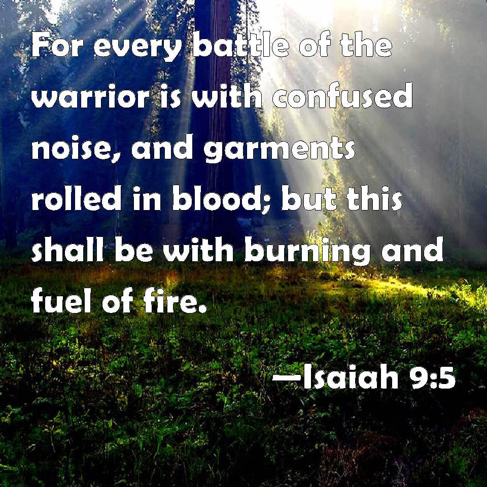 Choose a Background Isaiah 9:5 For every battle of the warrior is with confused noise, and garments rolled in blood; but this shall be with burning and fuel of fire. KJV: For every battle of the warrior is with confused noise, and garments rolled in blood; but this shall be with burning and fuel of fire. DRB: For every violent taking of spoils, with tumult, and garment mingled with blood, shall be burnt, and be fuel for the fire. DBT: For every boot of him that is shod for the tumult, and the garment rolled in blood, shall be for burning, fuel for fire. ERV: For all the armour of the armed man in the tumult, and the garments rolled in blood, shall even be for burning, for fuel of fire. WBT: For every battle of the warrior is with confused noise, and garments rolled in blood; but this shall be with burning and fuel of fire. WEB: For all the armor of the armed man in the noisy battle, and the garments rolled in blood, will be for burning, fuel for the fire. YLT: For every battle of a warrior is with rushing, and raiment rolled in blood, And it hath been for burning — fuel of fire.Links Isaiah 9:5 NIV • Isaiah 9:5 NLT • Isaiah 9:5 ESV • Isaiah 9:5 NASB • Isaiah 9:5 KJV • Isaiah 9:5 Interlinear • Isaiah 9:5 Commentaries • Isaiah 9:5 Parallel Texts • Isaiah 9:5 Bible Apps • Isaiah 9:5 Parallel • Bible Hub |