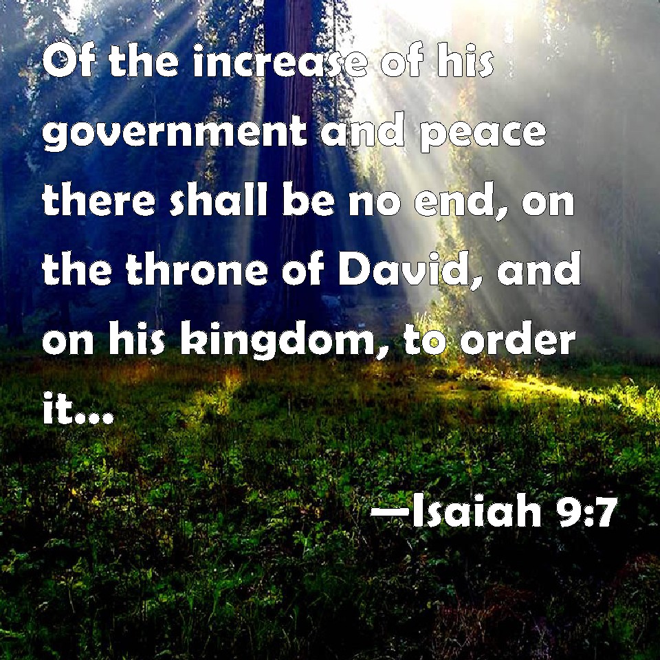 Choose a Background Isaiah 9:7 Of the increase of his government and peace there shall be no end, on the throne of David, and on his kingdom, to order it, and to establish it with judgment and with justice from now on even for ever. The zeal of the LORD of hosts will perform this. KJV: Of the increase of his government and peace there shall be no end, upon the throne of David, and upon his kingdom, to order it, and to establish it with judgment and with justice from henceforth even for ever. The zeal of the LORD of hosts will perform this. DRB: His empire shall be multiplied, and there shall be no end of peace: he shall sit upon the throne of David, and upon his kingdom; to establish it and strengthen it with judgment and with justice, from henceforth and for ever: the zeal of the Lord of hosts will perform this. DBT: Of the increase of his government and of peace there shall be no end, upon the throne of David and over his kingdom, to establish it, and to uphold it with judgment and with righteousness, from henceforth even for ever. The zeal of Jehovah of hosts will perform this. ERV: Of the increase of his government and of peace there shall be no end, upon the throne of David, and upon his kingdom, to establish it, and to uphold it with judgment and with righteousness from henceforth even for ever. The zeal of the LORD of hosts shall perform this. WBT: Of the increase of his government and peace there shall be no end, upon the throne of David, and upon his kingdom, to order it, and to establish it with judgment and with justice from henceforth even for ever. The zeal of the LORD of hosts will perform this. WEB: Of the increase of his government and of peace there shall be no end, on the throne of David, and on his kingdom, to establish it, and to uphold it with justice and with righteousness from that time on, even forever. The zeal of Yahweh of Armies will perform this. YLT: To the increase of the princely power, And of peace, there is no end, On the throne of David, and on his kingdom, To establish it, and to support it, In judgment and in righteousness, Henceforth, even unto the age, The zeal of Jehovah of Hosts doth this.Links Isaiah 9:7 NIV • Isaiah 9:7 NLT • Isaiah 9:7 ESV • Isaiah 9:7 NASB • Isaiah 9:7 KJV • Isaiah 9:7 Interlinear • Isaiah 9:7 Commentaries • Isaiah 9:7 Parallel Texts • Isaiah 9:7 Bible Apps • Isaiah 9:7 Parallel • Bible Hub |