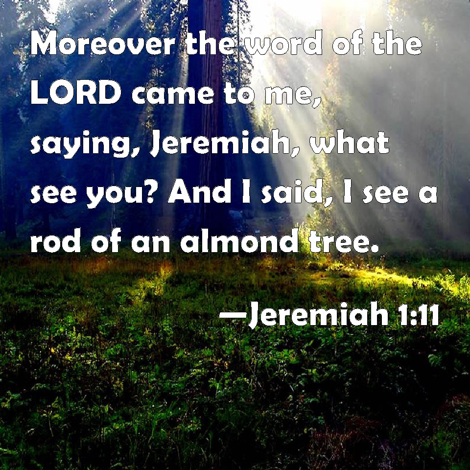Choose a Background Jeremiah 1:11 Moreover the word of the LORD came to me, saying, Jeremiah, what see you? And I said, I see a rod of an almond tree. KJV: Moreover the word of the LORD came unto me, saying, Jeremiah, what seest thou? And I said, I see a rod of an almond tree. DRB: And the word of the Lord came to me, saying: What seest thou, Jeremias? And I said: I see a rod watching. DBT: And the word of Jehovah came to me, saying, Jeremiah, what seest thou? And I said, I see a rod of an almond-tree. ERV: Moreover the word of the LORD came unto me, saying, Jeremiah, what seest thou? And I said, I see a rod of an almond tree. WBT: Moreover the word of the LORD came to me, saying, Jeremiah, What seest thou? And I said, I see a rod of an almond-tree. WEB: Moreover the word of Yahweh came to me, saying, "Jeremiah, what do you see?" I said, "I see a branch of an almond tree." YLT: And there is a word of Jehovah unto me, saying, 'What art thou seeing, Jeremiah?' And I say, 'A rod of an almond tree I am seeing.'Links Jeremiah 1:11 NIV • Jeremiah 1:11 NLT • Jeremiah 1:11 ESV • Jeremiah 1:11 NASB • Jeremiah 1:11 KJV • Jeremiah 1:11 Interlinear • Jeremiah 1:11 Commentaries • Jeremiah 1:11 Parallel Texts • Jeremiah 1:11 Bible Apps • Jeremiah 1:11 Parallel • Bible Hub |