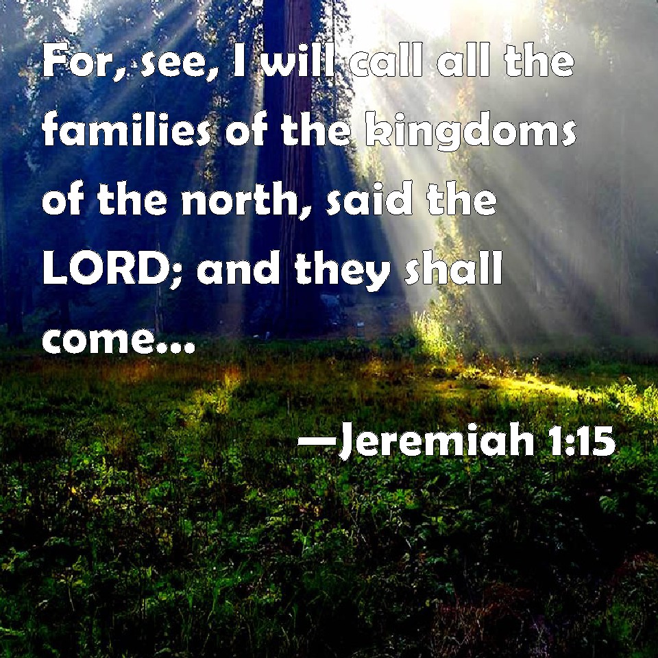 Choose a Background Jeremiah 1:15 For, see, I will call all the families of the kingdoms of the north, said the LORD; and they shall come, and they shall set every one his throne at the entering of the gates of Jerusalem, and against all the walls thereof round about, and against all the cities of Judah. KJV: For, lo, I will call all the families of the kingdoms of the north, saith the LORD; and they shall come, and they shall set every one his throne at the entering of the gates of Jerusalem, and against all the walls thereof round about, and against all the cities of Judah. DRB: For behold I will call together all the families of the kingdoms of the north: saith the Lord: and they shall come, and shall set every one his throne in the entrance of the gates of Jerusalem, and upon all the walls thereof round about, and upon all the cities of Juda, DBT: For behold, I am calling all the families of the kingdoms of the north, saith Jehovah, and they shall come, and they shall set every one his throne at the entering of the gates of Jerusalem, and against all the walls thereof round about, and against all the cities of Judah: ERV: For, lo, I will call all the families of the kingdoms of the north, saith the LORD; and they shall come, and they shall set every one his throne at the entering of the gates of Jerusalem, and against all the walls thereof round about, and against all the cities of Judah. WBT: For lo, I will call all the families of the kingdoms of the north, saith the LORD; and they shall come, and they shall set every one his throne at the entrance of the gates of Jerusalem, and against all its walls around, and against all the cities of Judah. WEB: For, behold, I will call all the families of the kingdoms of the north," says Yahweh; "and they shall come, and they shall each set his throne at the entrance of the gates of Jerusalem, and against all its walls all around, and against all the cities of Judah. YLT: For, lo, I am calling for all families of the kingdoms of the north, — an affirmation of Jehovah — and they have come, and put each his throne at the opening of the gates of Jerusalem, and by its walls round about, and by all cities of Judah.Links Jeremiah 1:15 NIV • Jeremiah 1:15 NLT • Jeremiah 1:15 ESV • Jeremiah 1:15 NASB • Jeremiah 1:15 KJV • Jeremiah 1:15 Interlinear • Jeremiah 1:15 Commentaries • Jeremiah 1:15 Parallel Texts • Jeremiah 1:15 Bible Apps • Jeremiah 1:15 Parallel • Bible Hub |