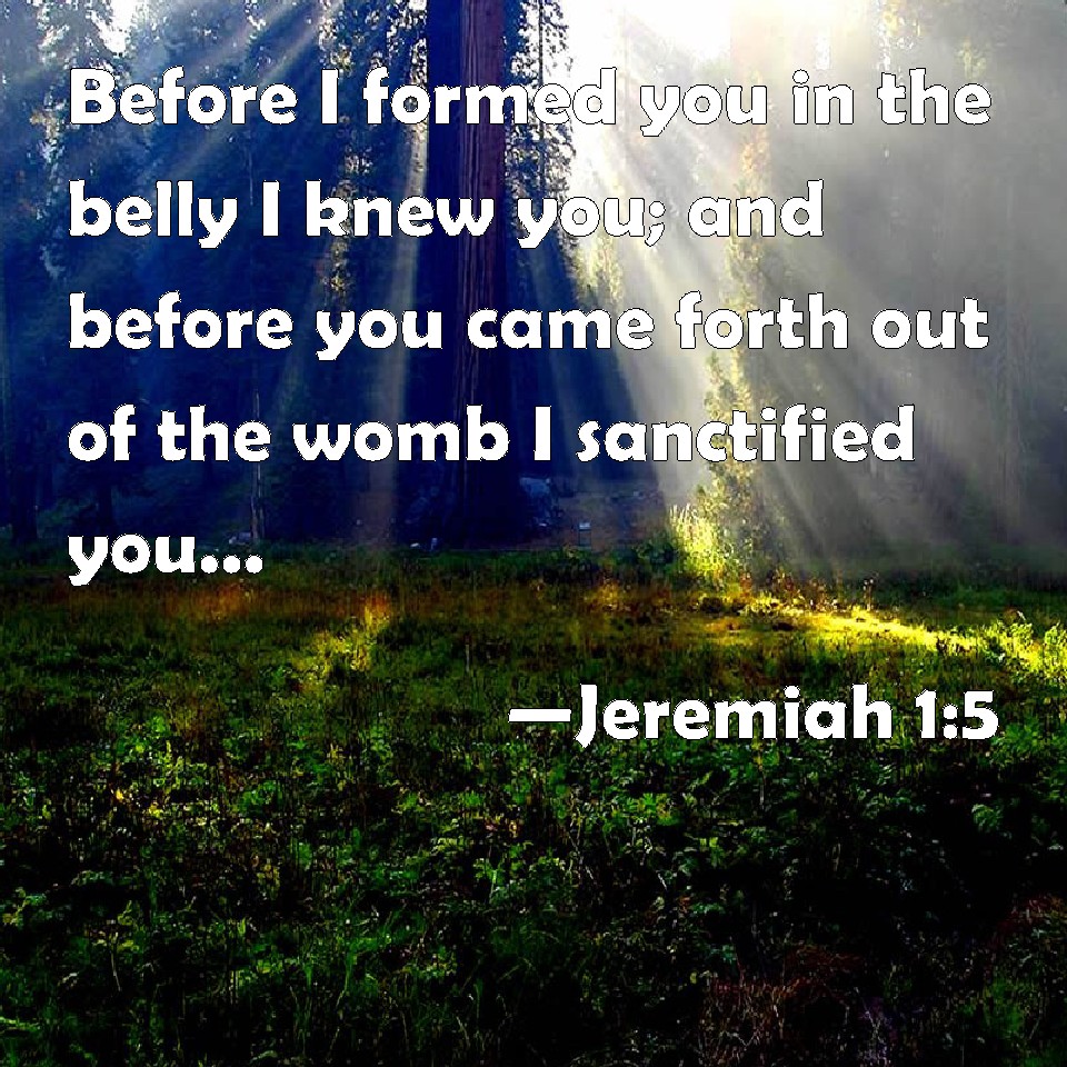 Choose a Background Jeremiah 1:5 Before I formed you in the belly I knew you; and before you came forth out of the womb I sanctified you, and I ordained you a prophet to the nations. KJV: Before I formed thee in the belly I knew thee; and before thou camest forth out of the womb I sanctified thee, and I ordained thee a prophet unto the nations. DRB: Before I formed thee in the bowels of thy mother, I knew thee: and before thou camest forth out of the womb, I sanctified thee, and made thee a prophet unto the nations. DBT: Before I formed thee in the belly I knew thee; and before thou camest forth out of the womb I hallowed thee, I appointed thee a prophet unto the nations. ERV: Before I formed thee in the belly I knew thee, and before thou camest forth out of the womb I sanctified thee; I have appointed thee a prophet unto the nations. WBT: Before I formed thee in embryo I knew thee; and before thou wast born I sanctified thee, and I ordained thee a prophet to the nations. WEB: "Before I formed you in the belly, I knew you. Before you came forth out of the womb, I sanctified you. I have appointed you a prophet to the nations." YLT: 'Before I form thee in the belly, I have known thee; and before thou comest forth from the womb I have separated thee, a prophet to nations I have made thee.'Links Jeremiah 1:5 NIV • Jeremiah 1:5 NLT • Jeremiah 1:5 ESV • Jeremiah 1:5 NASB • Jeremiah 1:5 KJV • Jeremiah 1:5 Interlinear • Jeremiah 1:5 Commentaries • Jeremiah 1:5 Parallel Texts • Jeremiah 1:5 Bible Apps • Jeremiah 1:5 Parallel • Bible Hub |