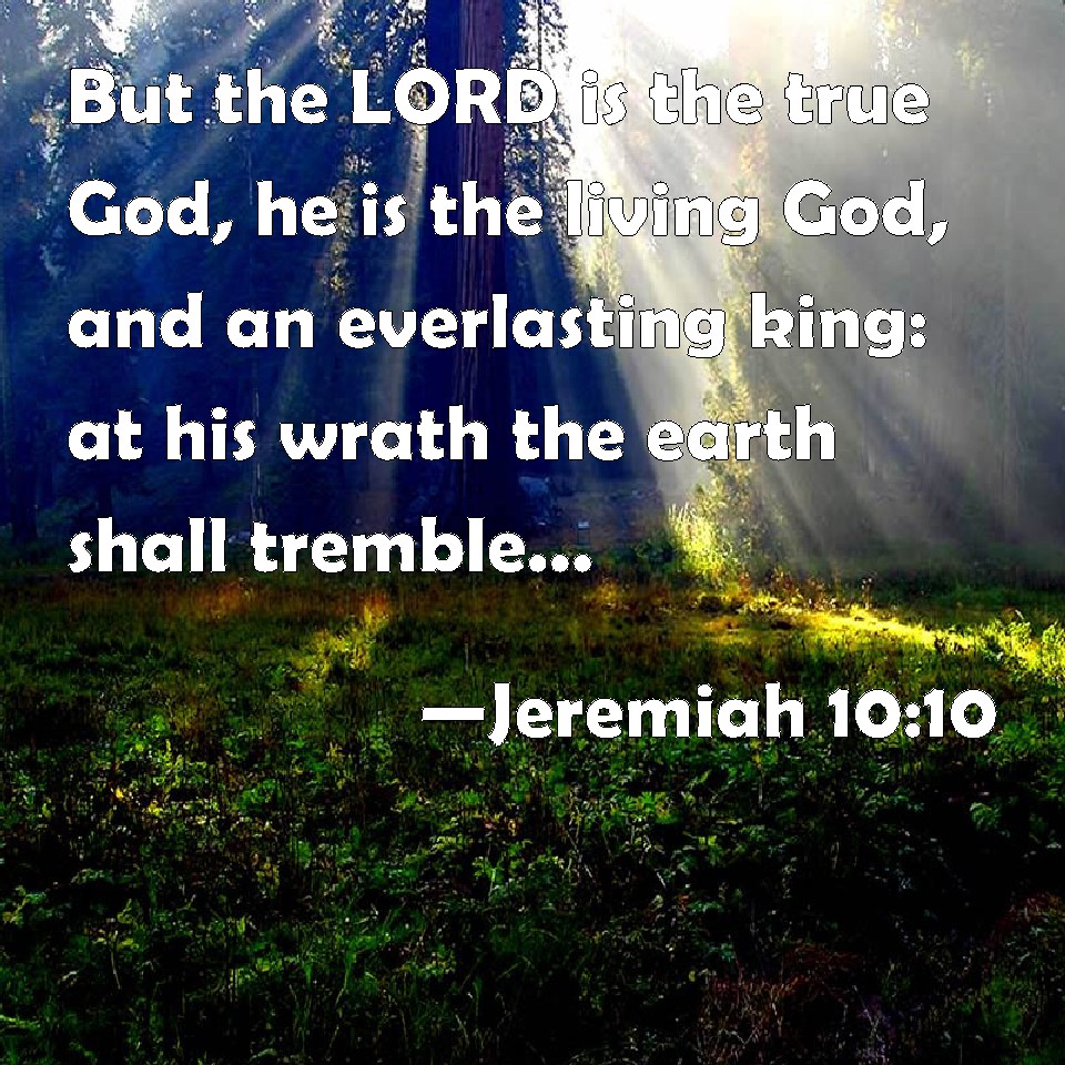 Choose a Background Jeremiah 10:10 But the LORD is the true God, he is the living God, and an everlasting king: at his wrath the earth shall tremble, and the nations shall not be able to abide his indignation. KJV: But the LORD is the true God, he is the living God, and an everlasting king: at his wrath the earth shall tremble, and the nations shall not be able to abide his indignation. DRB: But the Lord is the true God: he is the living God, and the everlasting king, at his wrath the earth shall tremble, and the nations shall not be able to abide his threatening. DBT: But Jehovah Elohim is truth; he is the living God, and the King of eternity. At his wrath the earth trembleth, and the nations cannot abide his indignation. ERV: But the LORD is the true God; he is the living God, and an everlasting king: at his wrath the earth trembleth, and the nations are not able to abide his indignation. WBT: But the LORD is the true God, he is the living God, and an everlasting king: at his wrath the earth shall tremble, and the nations shall not be able to abide his indignation. WEB: But Yahweh is the true God; he is the living God, and an everlasting King: at his wrath the earth trembles, and the nations are not able to withstand his indignation. YLT: And Jehovah is a God of truth, He is a living God, and a king age-during, From His wrath shake doth the earth, And nations endure not His indignation.Links Jeremiah 10:10 NIV • Jeremiah 10:10 NLT • Jeremiah 10:10 ESV • Jeremiah 10:10 NASB • Jeremiah 10:10 KJV • Jeremiah 10:10 Interlinear • Jeremiah 10:10 Commentaries • Jeremiah 10:10 Parallel Texts • Jeremiah 10:10 Bible Apps • Jeremiah 10:10 Parallel • Bible Hub |