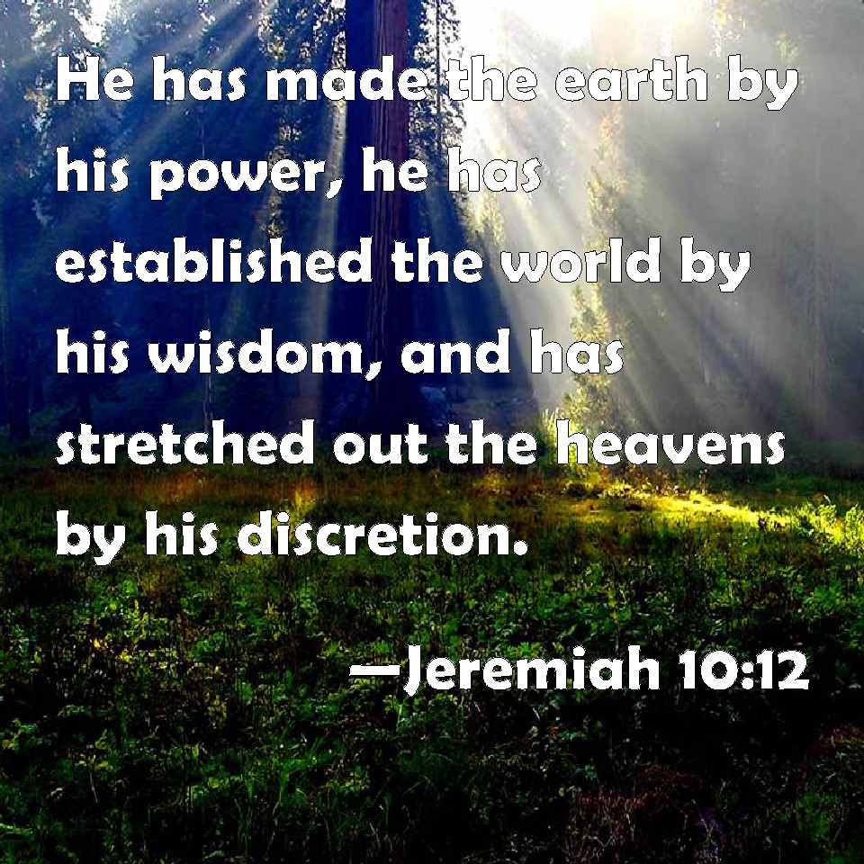 Choose a Background Jeremiah 10:12 He has made the earth by his power, he has established the world by his wisdom, and has stretched out the heavens by his discretion. KJV: He hath made the earth by his power, he hath established the world by his wisdom, and hath stretched out the heavens by his discretion. DRB: He that maketh the earth by his power, that prepareth the world by his wisdom, and stretcheth out the heavens by his knowledge. DBT: He hath made the earth by his power, he hath established the world by his wisdom, and hath stretched out the heavens by his understanding. ERV: He hath made the earth by his power, he hath established the world by his wisdom, and by his understanding hath he stretched out the heavens: WBT: He hath made the earth by his power, he hath established the world by his wisdom, and hath stretched out the heavens by his discretion. WEB: He has made the earth by his power, he has established the world by his wisdom, and by his understanding has he stretched out the heavens: YLT: The maker of the earth by His power, The establisher of the world by His wisdom, Who, by His understanding, stretched forth the heavens,Links Jeremiah 10:12 NIV • Jeremiah 10:12 NLT • Jeremiah 10:12 ESV • Jeremiah 10:12 NASB • Jeremiah 10:12 KJV • Jeremiah 10:12 Interlinear • Jeremiah 10:12 Commentaries • Jeremiah 10:12 Parallel Texts • Jeremiah 10:12 Bible Apps • Jeremiah 10:12 Parallel • Bible Hub |