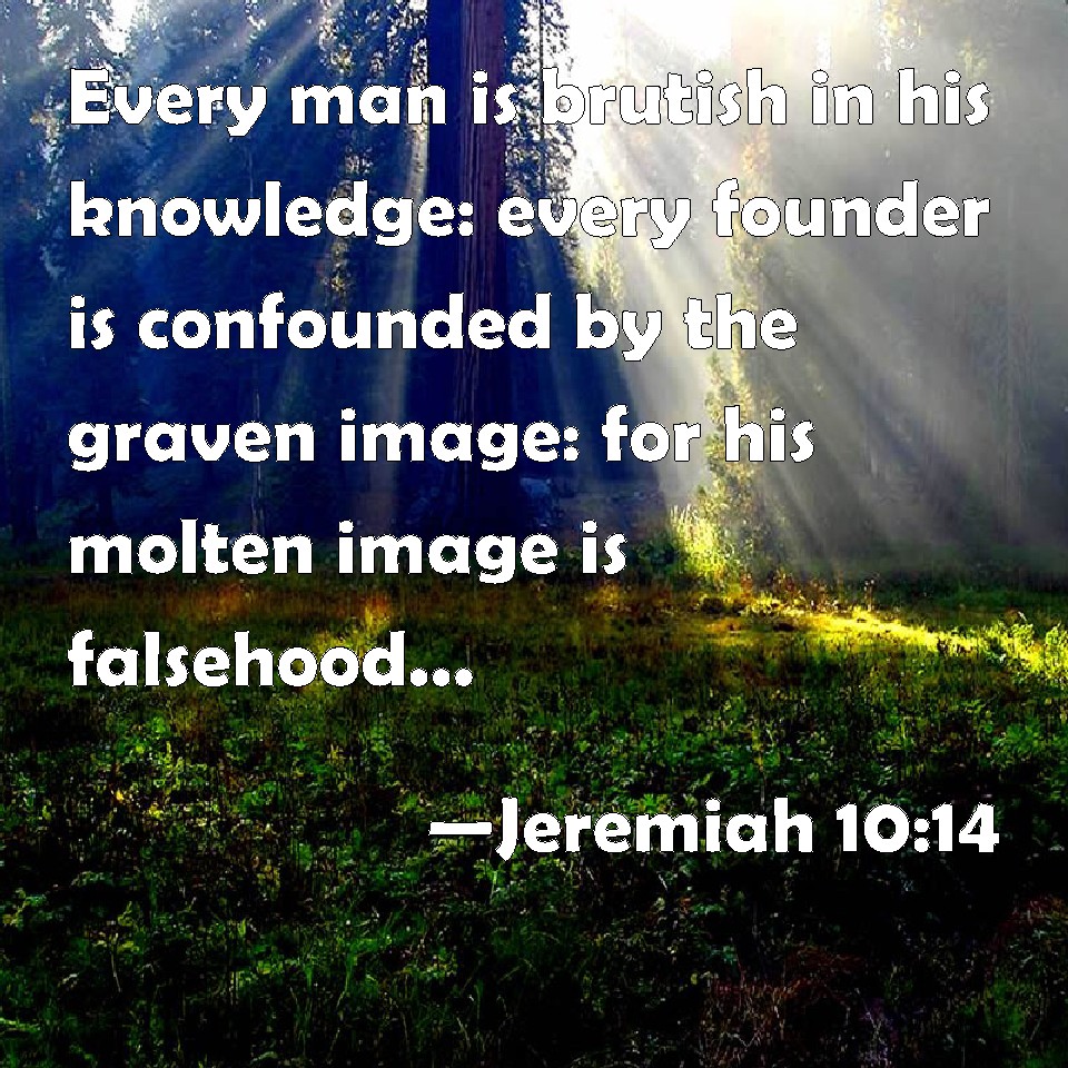 Choose a Background Jeremiah 10:14 Every man is brutish in his knowledge: every founder is confounded by the graven image: for his molten image is falsehood, and there is no breath in them. KJV: Every man is brutish in his knowledge: every founder is confounded by the graven image: for his molten image is falsehood, and there is no breath in them. DRB: Every man is become a fool for knowledge every artist is confounded in his graven idol: for what he hath cast is false, and there is no spirit in them. DBT: Every man is become brutish, bereft of knowledge; every founder is put to shame by the graven image, for his molten image is falsehood, and there is no breath in them. ERV: Every man is become brutish and is without knowledge; every goldsmith is put to shame by his graven image: for his molten image is falsehood, and there is no breath in them. WBT: Every man is brutish in his knowledge: every founder is confounded by the graven image: for his molten image is falsehood, and there is no breath in them. WEB: Every man is become brutish [and is] without knowledge; every goldsmith is disappointed by his engraved image; for his molten image is falsehood, and there is no breath in them. YLT: Brutish is every man by knowledge, Put to shame is every refiner by a graven image, For false is his molten image. And there is no breath in them.Links Jeremiah 10:14 NIV • Jeremiah 10:14 NLT • Jeremiah 10:14 ESV • Jeremiah 10:14 NASB • Jeremiah 10:14 KJV • Jeremiah 10:14 Interlinear • Jeremiah 10:14 Commentaries • Jeremiah 10:14 Parallel Texts • Jeremiah 10:14 Bible Apps • Jeremiah 10:14 Parallel • Bible Hub |